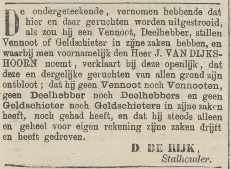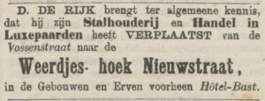 In april 1877 voldoet het onderkomen aan de Vossenstraat niet langer en verhuist De Rijk naar de hoek van de Weerdjesstraat en de Nieuwstraat, waar voorheen hotel Bast zat. Hier groeit de firma verder. De Rijk adverteert met ‘in den loop der volgende week een nieuw transport luxe-paarden’ te krijgen voor de handel en is blijkbaar zo ambitieus dat dit scheve ogen van concurrenten oplevert. Achter zijn rug fluisteren ze dat er een geldschieter achter moet zitten en de naam van wijnhandelaar Johannes van Dijkshoorn van Huize Voorburg in Elden valt. Maar dat is, zo verklaart Dirk openlijk in de krant van 16 april, volkomen nonsens en hij steekt overal eigen geld in. De paardenhandel is echter niet de kwaliteit van De Rijk, die daarin niet op kan tegen het scherpe inkoopbeleid en de goede naam die stadgenoot Riemer heeft opgebouwd.