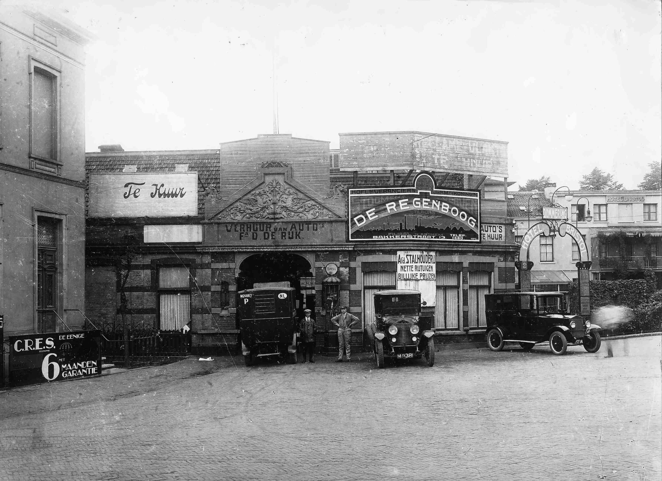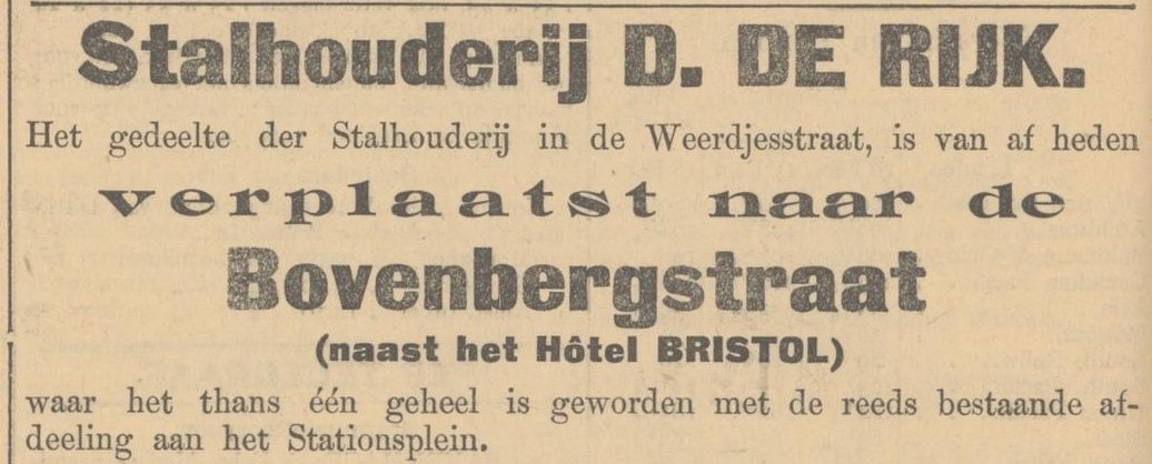 De elektrische schel luidt een nieuw tijdperk in. In 1911 verkopen de gezusters De Rijk het pand aan de Weerdjesstraat aan een combinatie die er een venduhuis voor notarissen zal vestigen. “Toen de grootouders van het tegenwoordig levende geslacht nog maar kleine dreumessen waren, toen hotsten en botsten over de puntige keisteenen van ’t rustige, slaperige provinciestadje Arnhem reeds de rijtuigen en andere vehikels van den stalhouder de Rijk. Hoelang deze stalhouderij al precies bestaat, weten we niet, doch dat haar leeftijd al aardig naar de honderd jaar loopt, is zeker. Toch heeft deze zaak nog in geen enkel opzicht te lijden van de kwalen van den ouden dag, integendeel, met ieder nieuw geslacht, dat aan het hoofd kwam te staan, scheen er ook nieuw leven in de affaire te komen, zodat tot op het ogenblik gezegd kan worden, dat de stalhouderij de Rijk met den tijd is meegegaan. Voor de zware, oude rijtuigen zijn elegante coupeetjes, landauers op gummibanden, andere moderne voertuigen in de plaats gekomen, het aantal breidde zich steeds uit en met het vreemdelingenverkeer groeide ook het aantal der welbekende Janpleziers. Welk een bergruimte er nodig is voor al deze rijtuigen, voor de daarbij behorende paarden, voor het hooi, enz. kan men zich denken. Tot nu toe was dit alles ondergebracht op twee punten der stad, n.l. op het Stationsplein en in de Weerdjesstraat. Om verschillende redenen was het echter wenschelijk de gehele zaak in één gebouwencomplex te vestigen en dit is thans geschied, doordien de firma er in geslaagd is, een der achter den stal op het Stationsplein gelegen woningen van de Boven-Bergstraat aan te kopen. Daardoor kreeg zij de beschikking over een flink huis met groten tuin, een deel van het woonhuis is afgebroken en de tuin is volgebouwd met nieuwe stallen en rijtuigbergplaatsen. Daar vindt men thans den ruimen, luchtigen paardenstal, daarnaast de grote rijtuigbergplaats met een aparte bergruimte voor de betere rijtuigen, terwijl een lift het mogelijk maakt de rijtuigen tot zelfs op zolder te bergen. Boven zijn verder de grote hooizolders, door het gehele gebouw, tot in de hanenbalken gloeien de electrische gloeilampjes, verschillende open plaatsjes zijn bestemd voor het schoonmaken der rijtuigen, een uitgang naar de Boven-Bergstraat, juist naast hotel Bristol, maakt het mogelijk ook van die zijde den stal in te rijden, in één woord, de firma de Rijk beschikt thans over een prachtige bergruimte en onder de goede leiding van mej. de Rijk en den heer Koning kan zij met gerustheid weer het komende zomerseizoen tegemoet zien.” (Arnh.Cour. 18-2-1911).