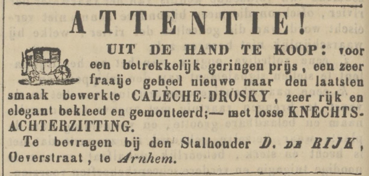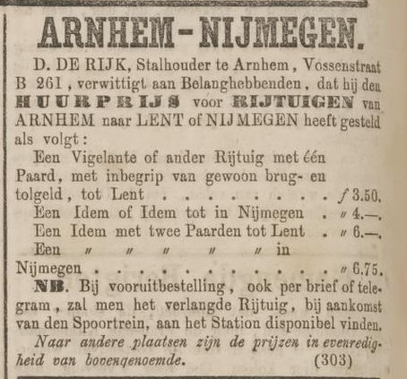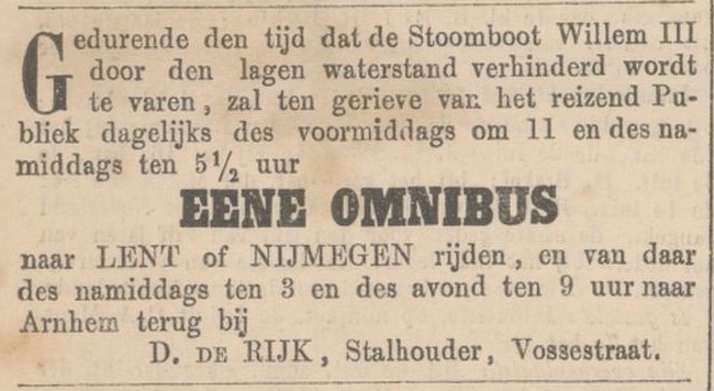 Een reis van Arnhem naar Nijmegen is in die tijd nog een toestand, waarvoor de diligences van Van Gend & Loos het aangewezen middel zijn. Maar die wagens zijn krap en bedompt. Bovendien moet de diligence net als alle andere voertuigen per pont de Waal bij Nijmegen oversteken en dat is een gedoe. Het alternatief is de stoomboot Willem III die met een omweg naar Lobith de verbinding verzorgt, tenzij de rivieren weer ‘ns dichtvriezen of zoals in oktober 1865 de waterstand te laag is, waarmee De Rijk zijn kans ziet om een dagelijkse omnibus te laten rijden. Dat is beter reizen dan opeengepakt in de diligence. Nog beter is naar Nijmegen per huurrijtuig. ƒ 3,50 met één paard voor een vigilante naar Lent inclusief brug- en tolgeld, doorrijden tot Nijmegen kost twee kwartjes meer en met twee paarden naar Nijmegen ƒ 6,75. Dat zijn de tarieven in 1873, waarbij het per brief of telegram bestelde rijtuig in Arnhem bij het treinstation klaar staat te wachten. Wanneer in een strenge winter van het jaar daarop de Rijn dichtvriest en rijtuigen niet meer naar de overkant kunnen, heeft hij een oplossing door paarden en rijtuigen te stallen aan beide zijdes van de oever: “D. de Rijk, stalhouder, Vossenstraat, verwittigt aan zijne geachte clientèle, dat hij thans, en steeds zoo lang de overtogt voor rijtuigen over den Rijn door ijsgang of om andere reden is gestremd, in de gelegenheid is om rijtuigen van de overzijde der rivier af, naar Lent, Nijmegen of elders te leveren, voor de gewone en bekende prijzen, doordien hij tijdelijk een gedeelte zijner stalhouderij naar de overzijde der rivier heeft overgebragt.” (Arnh.Cour. 30-12-1874).