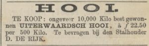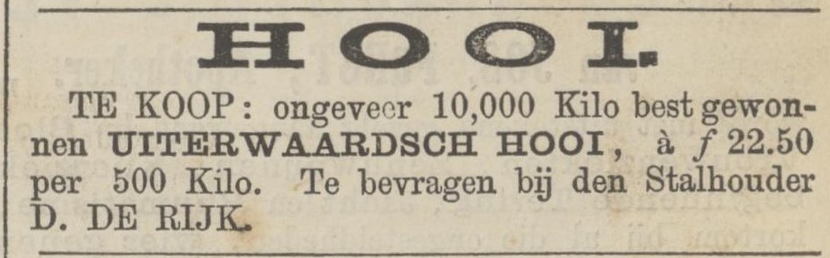 Hooi is de brandstof van de huurhouder. Een paard dat vol in het werk staat verorbert dagelijks met gemak tien kilo hooi en als De Rijk -zeg- dertig paarden heeft, heeft hij alleen al voor eigen gebruik ruim dertig hectare hooiland nodig. Daarom huurt hij onder andere vijf en een halve hectare van Baron van Pallandt van Oud-Beijerland. Voor die percelen met de naam De Groote Ossenkamp onder Westervoort, begrensd door den Schaapsdijk, de Arkenoachsteeg en de Spoorbaan, betaalt De Rijk zes jaar lang ƒ 508,- per jaar, plus de grond-, sluis-, polderlasten en een bijdrage in de kosten van het stoomgemaal. Van de vruchtbare grond komt meer hooi, dan voor eigen gebruik nodig, zo blijkt in 1870, wanneer De Rijk tien ton ‘uiterwaardsch’ hooi aankoopt à ƒ 22,50 per 500 kilo. Voor de rekenaars: bij een opbrengst van 3.500 kilo hooi per hectare leveren die 5,5 hectare een handelswaarde aan hooi op van ƒ 866,25. Maar dat is een kleinigheid vergeleken met de totale eigen behoefte. De stalhouders van de stad nemen gezamenlijk de uiterwaarden langs de Rijn in beslag. De Rijk huurt het land aan de Arkenoachsteeg naast de hooilanden van stalhouderij Riemer.