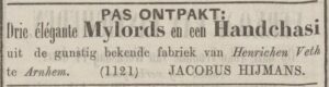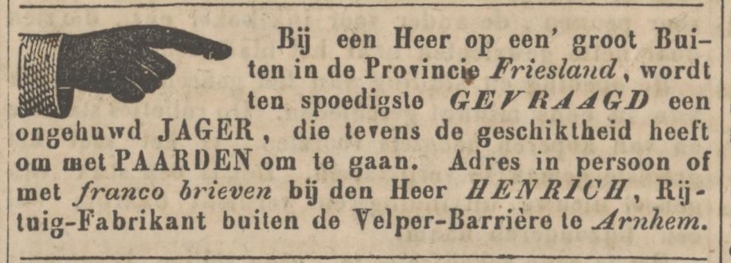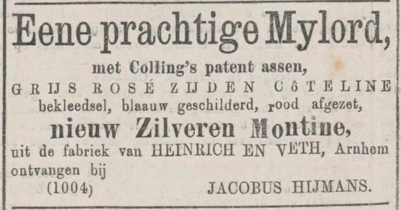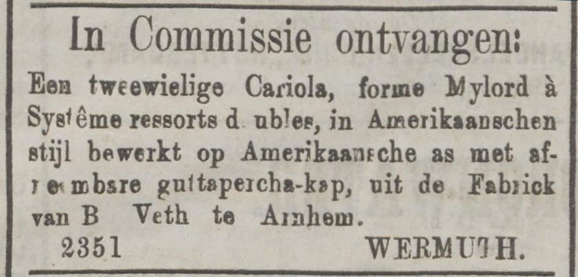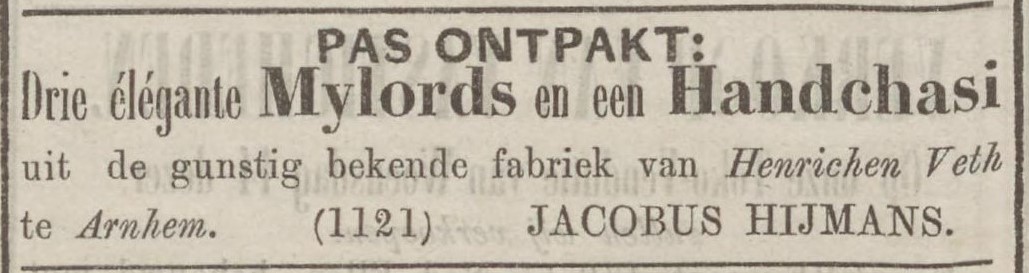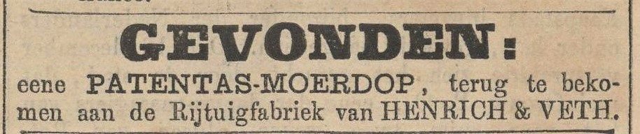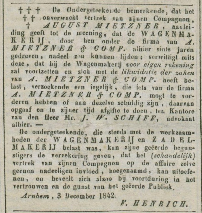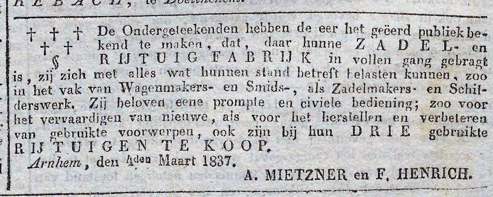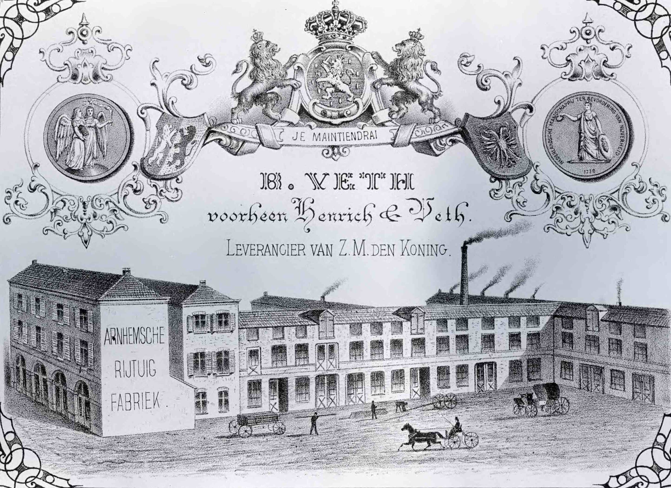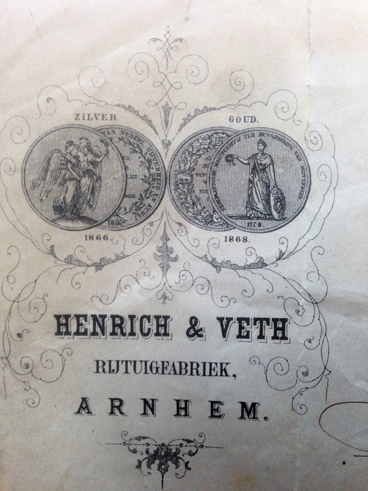 In 1837 openen August Mietzener en Johan Frederik Henrich (1810-1882) hun zadel- en rijtuigfabriek ‘buiten de Velper-barrière’ in Arnhem en beloven hun clientèle ‘eene prompte en civiele bediening’. De een is Duitser, de ander zoon van een bierbrouwer uit het Duitse Hanau en een Nederlandse moeder. Maar er is vanaf het begin een bepaalde spanning tussen beide kompanen: na een half jaar is de firmanaam gewijzigd van ‘A. Mietzener en F. Henrich’ in ‘Mietzener & Co.’. Vijf jaar gaat het nog goed, tot Mietzener op 3 december 1842 met de noorderzon vertrekt. Spoorloos. Het is een ‘schandelijk vertrek’ en hij laat Henrich, die blijkbaar al die tijd het werk in de wagen- en zadelmakerij voor zijn rekening had genomen, met de problemen achter. Die vereffent de schulden en het lukt hem een jaar later om Mietzener met terugwerkende kracht te schrappen uit de firmanaam. Het gaat Henrich dan goed; in 1845 trouwt hij met de Arnhemse onderwijzersdochter Anna Maria de Klerk en nog eens zeven jaar later exposeert hij op de nijverheidstentoonstelling in Arnhem een vigilante met ‘gebombeerde glazen’. Met regelmaat vraagt hij wagenmakers ‘met het bakwerk niet onbekend’, soms vier tegelijk. Zo komt ook Arie Veth (1831-1873) op zijn pad, die op zijn 24ste van Delft naar Arnhem verhuist en als timmermanszoon handig is met het houtwerk.
