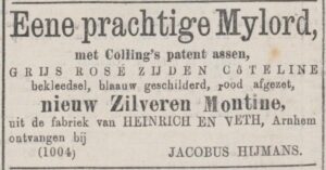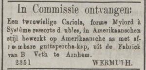 Het is bijzonder om je voor te stellen dat Veth in een aangrenzende hal zijn rijtuigen aanprijst voor de koloniën. Daarover vertelt de Arnhemsche Courant (28 juni): “De fraaie rijtuigen van den heer Veth in ogenschouw genomen: eene victoria, een coupé en een mylord, welk laatste rijtuig, met een stalen onderstel naar de allerlaatste vindingen gemaakt, om in Nederlandsch Indië met ponnies te worden bespannen, vooral de aandacht trok. De heer Veth heeft in de verbinding tusschen de assen en de draagveren eene nieuwe constructie, toegepast met een tusschenlegsel van caoutchouc, zodat de veren veel minder kans hebben van te breken en het rijtuig veel zachter loopt.” Nadat de inzending niet hoger komt dan een zilveren medaille, merkt de Parijse correspondent van de NRC (1 oktober) op: “Dat de mindere waardering die de rijtuigen van B. Veth en Stam (fabrikant uit Bennebroek, red.) gevonden hebben, te wijten is aan den onbuigzamen invloed der Fransche rijtuigmakers.” Zo veel als de Nederlandse rijtuigfabrikanten letten op de Franse modetrends en verfijning in modellen, zo weinig oog heeft Frankrijk voor wat zij maken.