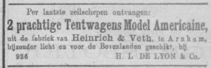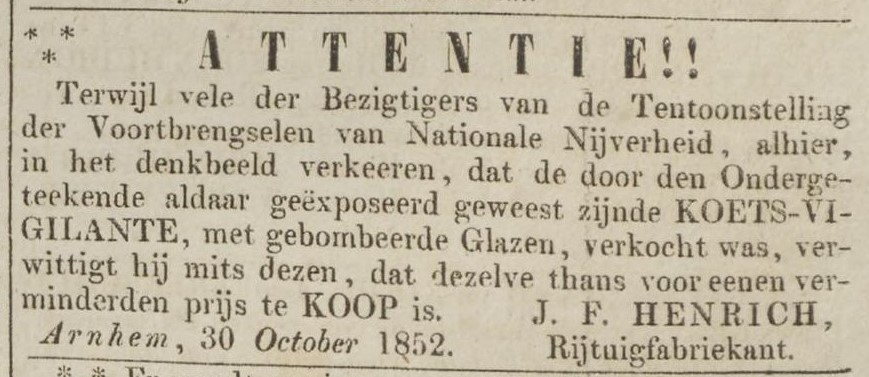 De redacteur van de Rotterdamsche Courant bezoekt de Nijverheidstentoonstelling in Amsterdam van 1866 en ziet daar drie rijtuigen van Hermans, een landauer van Te Riele uit Deventer, een dogcart van Frans de Hoo, de sociable van Herbertz, Wageningen, een voor de export naar Indië bestemde tentwagen van Donderwinkel en: “In den goeden ouden tijd van den bloei der Koninklijke Nederlandsche Paardenposterij zou ik de voorkeur gegeven hebben aan die Berline a coffre de breack van Henrich & Veth die in een oogenblik van een zeer gemakkelijk toe rijtuig te metamorphoseren is in een geheel open.” Het levert een zilveren medaille op.