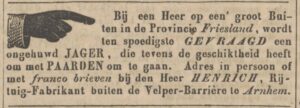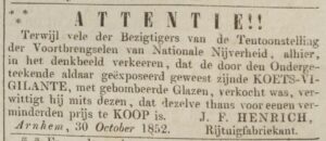 “Vrijdagavond zou achter de fabriek van de heeren Heinrich & Veth, te Arnhem, eene welput worden schoon gemaakt. Een werkman, daarmede belast, liet zich in de put af, met het ongelukkig gevolg dat hij, bedwelmd door de opstijgende gassen, viel en stikte. Een verwer, daar aanwezig, wilde nog eene poging aanwenden om hem te redden en werd eveneens het slagtoffer dezer edele daad. Niettegenstaande alle zoo spoedig mogelijk aangewende pogingen, is het niet mogen gelukken de levensgeesten weder op te wekken en zijn beide lijken onder geleide der politie naar het stadsziekenhuis overgebragt.” (Dragtster Courant 18 juli 1867.)