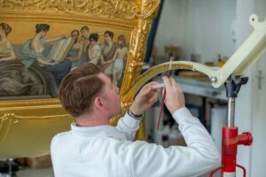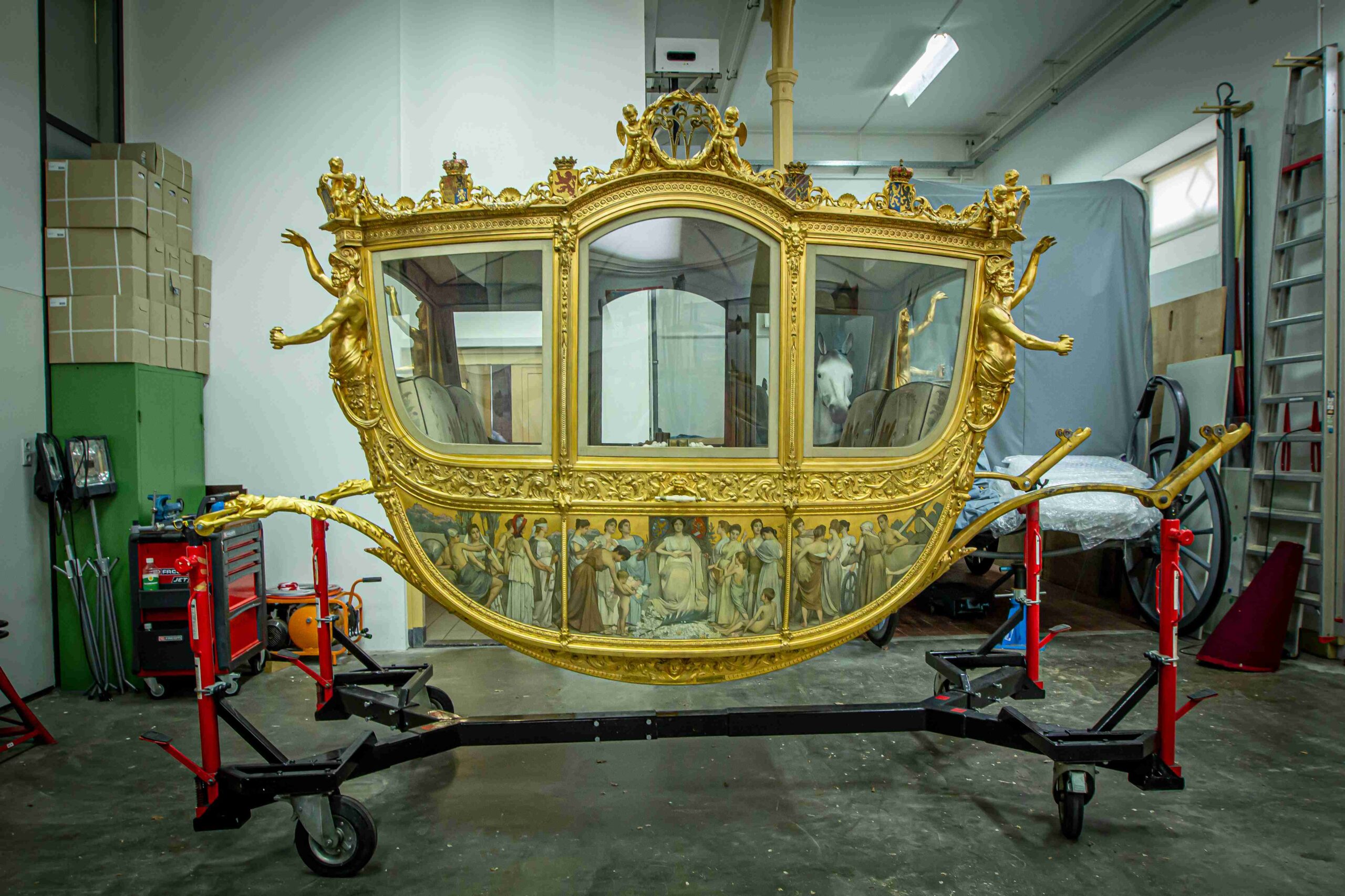 Stichting Hippomobiel Erfgoed geeft alvast een sneak preview van de restauratie van de Gouden Koets. Dit voorjaar is dit project na vijf jaar afgerond en gaat het rijtuig naar het Amsterdam Museum, waar op vrijdag 18 juni de tentoonstelling De Gouden Koets begint. Dan is de Gouden Koets voor het eerst weer voor publiek te zien en keert de koets tijdelijk terug naar de stad die hem in 1898 aan koningin Wilhelmina schonk, Amsterdam.