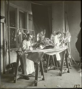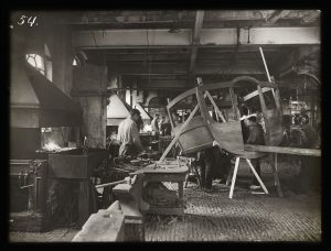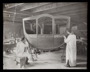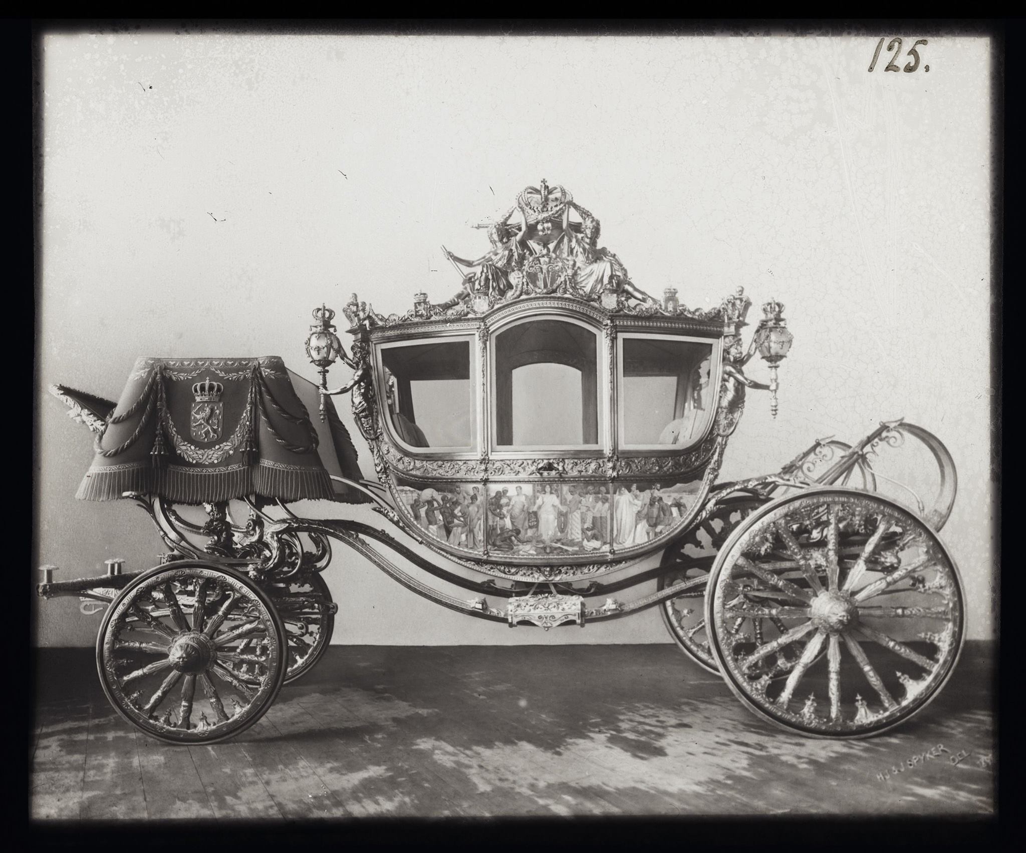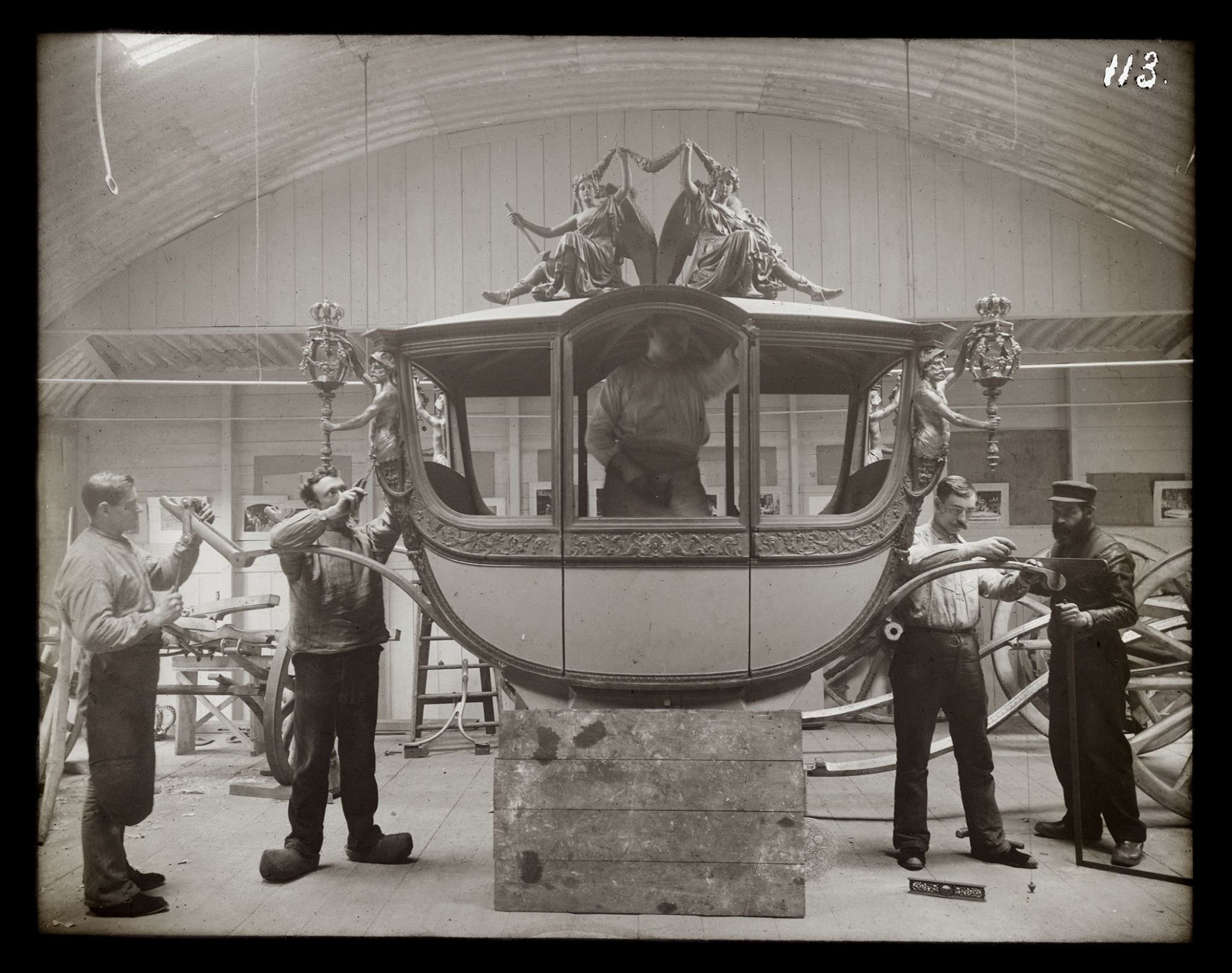 Twaalf mannen werkten in de fabriek Spyker bijna twee jaar lang aan de koets. De dames van Tesselschade, Arbeid Adelt en de meisjes uit het burgerweeshuis waren verantwoordelijk voor het borduurwerk van het gehele interieur van de koets. Ruim 15 miljoen steekjes. Hoewel de koets voor de eerste vrouw op de troon bestemd was, waren zij de enige vrouwen die een ambachtelijke bijdrage leverden.
