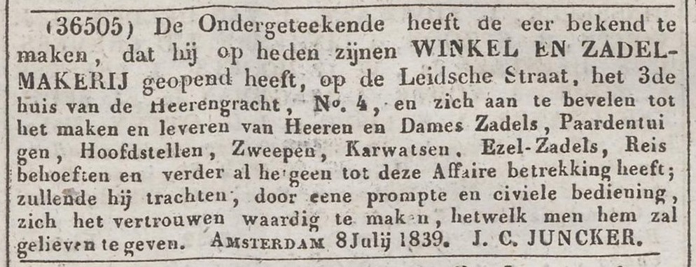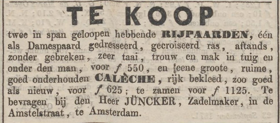 “Door toeval te koop”, een smyrnatapijt, te bevragen bij Juncker, zadelmaker aan de Amstelstraat in Amsterdam, maart 1861. Hij mag dan zadelmaker zijn, maar handelt in van alles. Twee jaar later een phaeton voor ƒ 230,-, een nieuw geolied jacht- of speelwagentje voor ‘een matigen prijs’ of een victoria-calèche, twee Hannoveraanse vosmerries, waarvan één gedresseerd onder het zadel, een span Engelse koetspaarden of de ‘welbekende’ Hongaarse paarden met napoleon, waarvan de kap voor en achter is te plaatsen. In de winkel ligt Amerikaans poetspoeder dat al het andere poetspoeder overtreft.