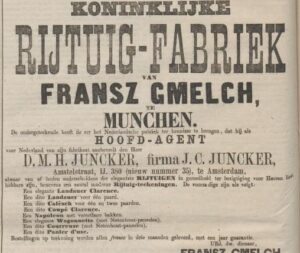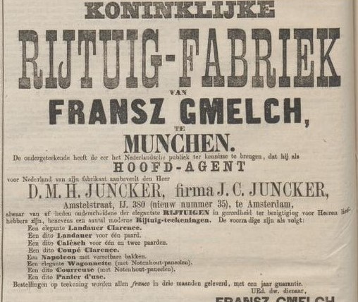In de Nederlandse rijtuigbouw slaat Frankrijk de klok, niet alleen bij de fabrikanten die Franse modellen bouwen en hun zonen in Parijs in de leer doen, ook bij de clientèle die alles wat Frans ruikt en klinkt als chique bestempelt. Engelse rijtuigen gaan nog, alhoewel minder gracieus, maar Duitse…. zijn smaakloos. Zo is de algemene gedachte. Dat is echter volkomen ten onrechte bij het zien van de blauw-gouden pronkstukken die vader en zoon Gmelch voor het huis Wittelsbacher in München bouwden. Of het de gala-barouche voor Koningin Theresia betreft, die van Koningin Marie of de grand duc van prins Ludwig Ferdinand van Beieren, ze zijn adembenemend mooi. Maar dat ontgaat de Nederlanders volkomen, want van een daadwerkelijk in de Amstelstraat verkocht rijtuig ontbreekt ieder spoor. Alleen op de Kunstnijverheidstentoonstelling van 1877 in Amsterdam oogst een rijtuig van Gmelch enige waardering: “Ook de coupé op caoutchoucwielen van Gmelch te München, wiens agent de firma Juncker is te Amsterdam, is zeer mooi en vooral bevallig van vorm.” (Nws vd Dg 10-9-1877). Na drie (?) jaar loopt de samenwerking ten einde. Toch krijgt het agentschap nog een aardig staartje in 1881 door het huwelijk van de 37-jarige Franz Gmelch junior en Theodora Susanna Louise Bodenheim, dochter van een koopman uit de Kalverstraat. Het resultaat van een gezellig avondje stappen met David Juncker of van een keurig soireetje? Wie zal het zeggen. Het stel vertrekt na het huwelijk naar München.