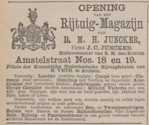 In 1875 maakt D.M.H. Junker, van de firma J.C. Juncker, bekend hoofdagent te zijn van de koninklijke rijtuigfabriek van Fransz Gmelch uit München, waarvoor hij in voorraad neemt een landauer-clarence, landauer voor één paard, een calèche, coupé-clarence, napoleon met portier en losse voor- en achterzitting, een wagonette met notenhouten panelen, een coureuse américain, een panier d’use en een berliner met blauw satijn bekleed. Bestellingen op basis van een tekening zegt hij in drie maanden franco te leveren. Door de expansiedrift van de jonge Juncker ontstaat een tekort aan ruimte. De zadelmakerij aan de Amstelstraat 35 knapt uit zijn voegen van de bedrijvigheid en daarom volgt op zaterdag 25 maart de feestelijke opening van een nieuw rijtuigenmagazijn tegenover het Grand-Theater, op huisnummer 19. Juncker heet daarna zadel- en rijtuigmaker, met gemiddeld zo’n vijftien rijtuigen op voorraad.