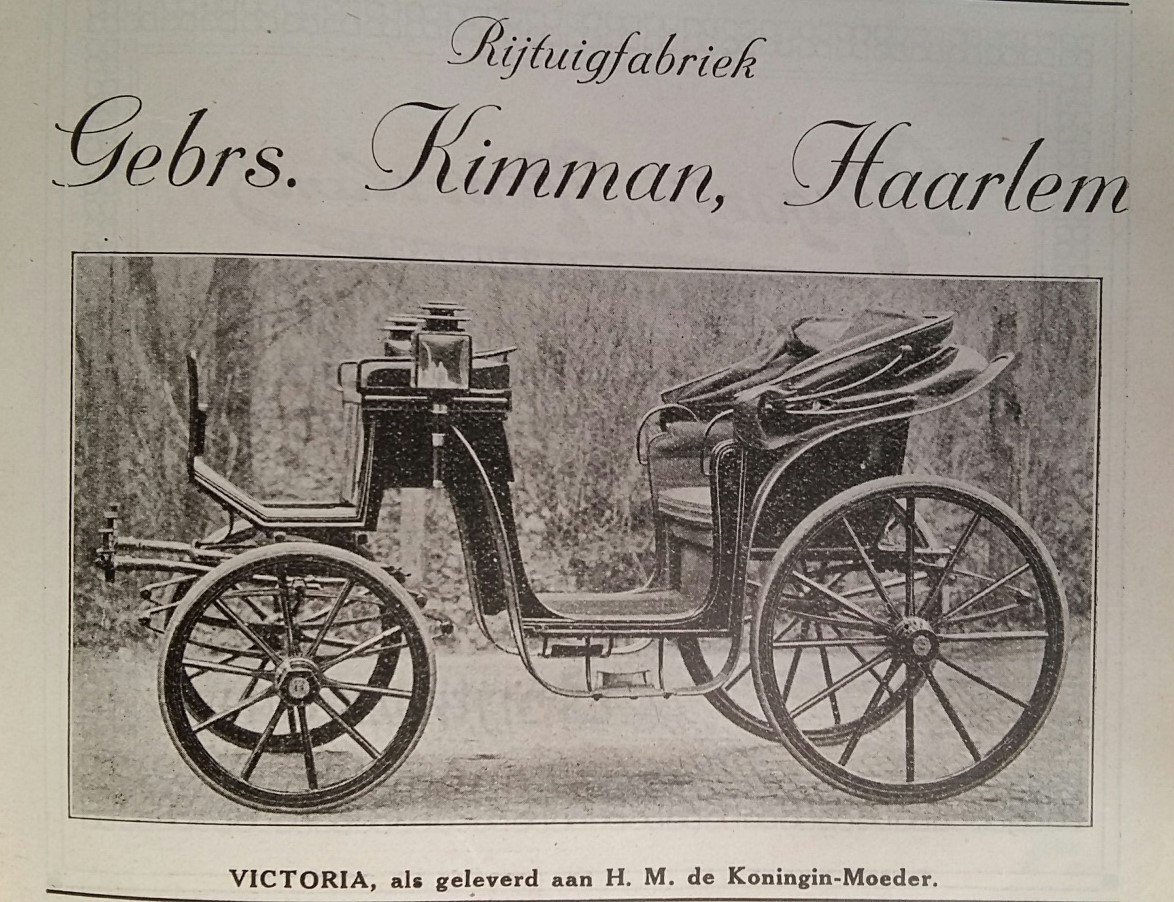 Terwijl haar man met een vierspan in 1915 deelneemt aan het concours hippique stuurt baronesse Van der Goes van Dirxland haar koetsier in de showring met eenzelfde victoria als die waarmee Emma zich door de hofstad laat rijden. De ‘halve wereld’ wil er in navolging van Hare Majesteit ook eentje. De kenners herkennen meteen het typische hoekige Kimman-model met onder de bok een opgerold schootkleed voor de passagiers. Dat kleed zit verscholen achter een leren flap met daarin een uurwerkje. Kimman heeft hiermee een uniek en populair model in serie gemaakt. De victoria is sowieso een perfect ‘instapmodel’ voor elegante dames en oudere heren, ook letterlijk vanwege zijn lage instap.