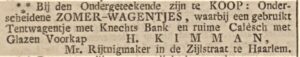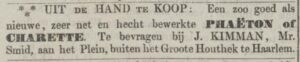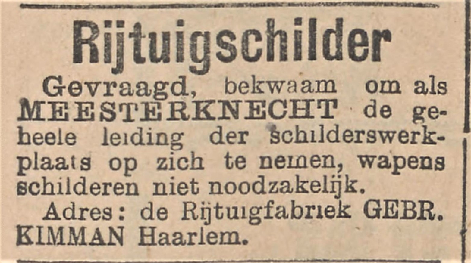 Op 30 mei een jaar later jubelt het Nieuws van den Dag: “De rijtuigschilder H. Willemsen, werkzaam aan de rijtuigfabriek van de heeren Gebrs. H. & F. Kimman, te Haarlem, ontving van het uitvoerend comité van de in 1894 te Antwerpen gehouden wereldtentoonstelling een diploma van eervolle vermelding, wegens het schilderen van twee door genoemde firma op die tentoonstelling ingezonden rijtuigen, welke met de gouden medaille werden bekroond.”