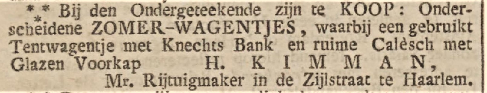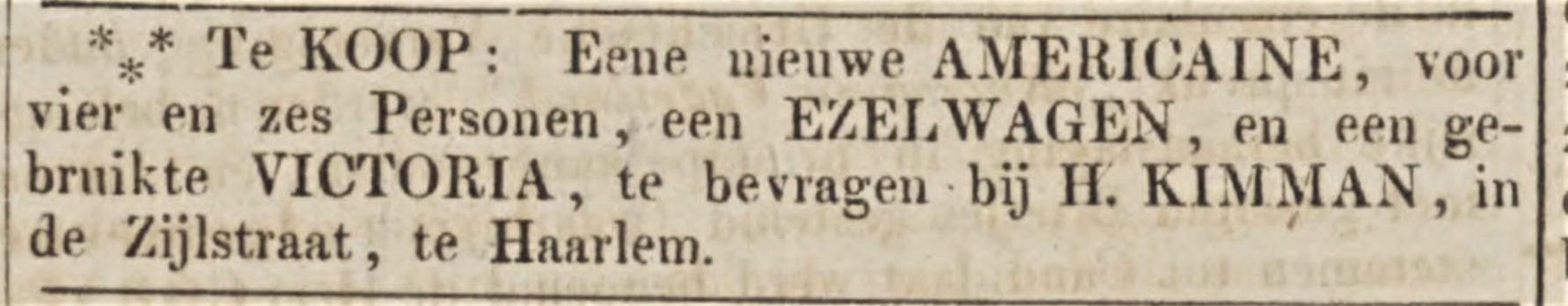 Hendricus Kimman (1808-1860) werkt er als meesterrijtuigmaker in de Zijlstraat aan calèches, ezelwagens en glazen wagens. Daar hebben hij en zijn gezin in 1830 de dan vijftienjarige Johannes Jacobus Beijnes, de latere grondlegger van de Koninklijke Fabriek van Rijtuigen en Spoorwagens, in de kost. Beijnes zal er in de leer zijn als knechtje. Ook in de leer voor het rijtuigvak zijn twee zonen. De oudste, Theodorus ‘Theo’ Gerardus, is ten tijde van een gemeentelijke registratie in 1849 als zeventienjarige wagenmaker vertrokken naar Amerika. Hij kan zijn vader niet aan de Zijlstraat opvolgen. De reden dat Theo emigreert is snel gevonden: die eerdere kostjongen Beijnes, die dan een eigen wagenmakerij heeft aan de Houtmarkt in Haarlem, en vader Kimman adverteren als eersten in Nederland met een ‘nieuwe amèricaine’. In Amerika, dat zich in de negentiende eeuw in industrieel opzicht razendsnel ontwikkelt, komt een grootschalige productie op gang van vederlichte en ranke rijtuigjes. Ze rollen er letterlijk van de lopende band. In 1860 staat de naam van Theo genoemd in de Illinois State Business Directory, als medevennoot van Kimman, Malefyt & Doyle, rijtuigfabriek in Chicago.