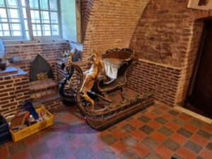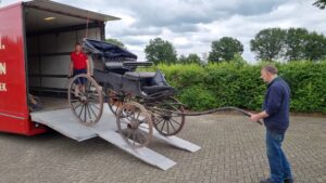 Amper iemand wist dat er in de kelder van het Utrechtse slot Zuylen nog een uniek rijtuig en een extravagante arrenslede stonden ‘verstopt’. Het rijtuig, een phaeton transformable, waarbij de banken zijn te verwisselen, is weliswaar in originele toestand, maar uitgedroogd en aangetast door de houtworm. Ook de rijk vergulde Dianaslede is hard toe aan serieuze conservering. Met hulp van de Stichting Hippomobiel Erfgoed zijn beide afgelopen week uit de kelder gehaald voor restauratie. Het rijtuig ging in onderdelen uit elkaar om het door de deur naar buiten te krijgen.