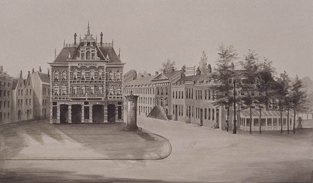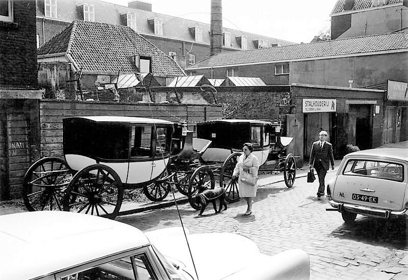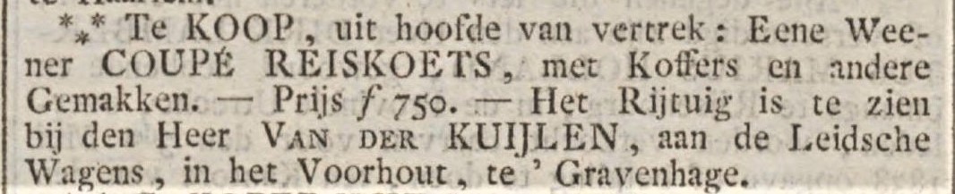 De stal in het Voorhout zit aan ‘de Leidsche Wagens’, waar als vanouds de diligences van en naar Leiden, Amsterdam, Utrecht en Haarlem halthouden, en waar Van der Kuijlen in 1838 een Weense coupé-reiskoets met koffers en andere gemakken te koop heeft voor de dan niet geringe som van ƒ 750,-.