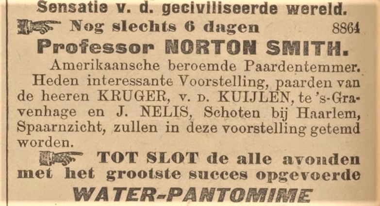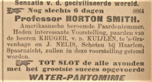 Een aardigheid vindt nog plaats in 1902 wanneer de stal paarden ter beschikking stelt voor het optreden van professor Norton Smith in het circus van Albert Schumann, dat een houten tent in de hofstad heeft neergezet. Deze ‘professor’ is een beroemde Amerikaan die in het korte tijdbestek van een circusvoorstelling wilde paarden zo mak als een lammetje maakt. Zijn aanpak past in een rage in die tijd van andere ‘horse tamers’ als Paul Rarey en professor Jesse Beery. Het zijn de voorgangers van de paardenfluisteraars die een eeuw later onder aanvoering van de eveneens Amerikaanse Monty Roberts een ‘andere’ manier van omgaan met paarden propageren.