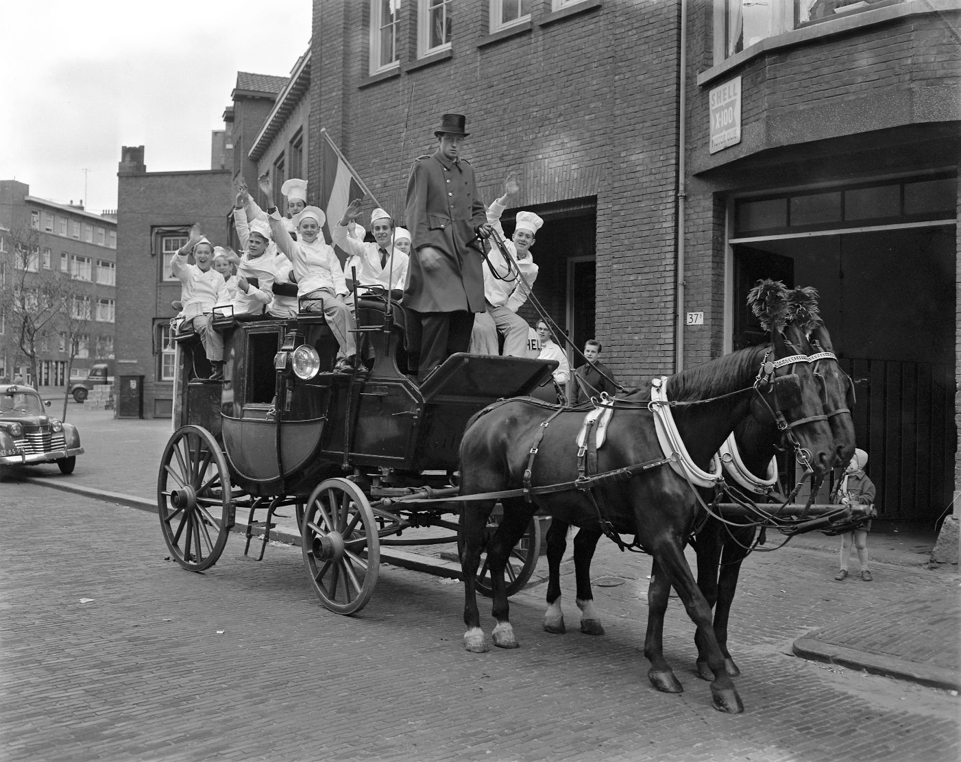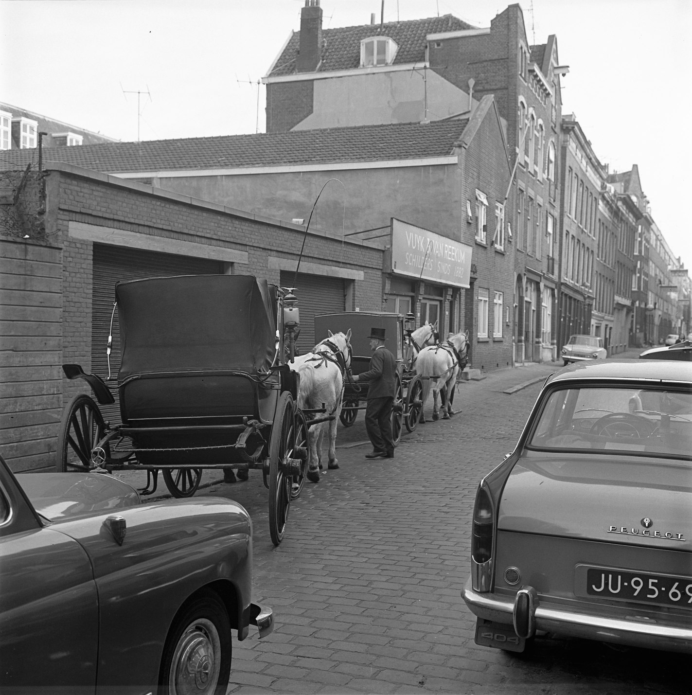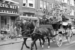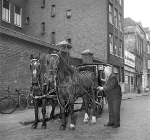 Het Algemeen Dagblad vervolgt: “’Het is een mooi iets’, zegt Jan Pley. ‘Als ik ’s morgens opsta verlang ik naar mijn paarden. het zijn net kinderen voor je. Ze kennen je allemaal. Het zijn fijne paarden. Er zijn trouwens geen kwaaie meer. Vroeger wel. Tegenwoordig worden die geslacht.’ Nu de winter van de straat is, is stalhouderij Pley weer gaan draaien. ‘Ja die lange winter is een moeilijke tijd geweest. Paarden zijn geen auto’s. Ze eten door, ook als ze stil staan. Maar nu is het al weer druk. Ik heb opdrachten binnen voor augustus en september. Ik zit niet vol voor die maanden, maar er is toch veel belangstelling. De mensen vinden het fijn met koetsen te trouwen. Vooral mensen die in hun werk meestal in auto’s zitten, bestellen voor een trouwpartij mijn koetsen. Ze willen het rustig hebben op hun trouwdag.’ Sinds kort is het werkterrein van stalhouder Pley tot Delft uitgebreid. Eind vorig jaar is er de laatste stalhouderij opgeheven en de heer Pley heeft daarvan de klandizie, onder anderen van de Delftse studenten, overgenomen. Als Jan Pley een nieuw paard koopt, dan leert hij het zelf zijn nieuwe ‘vak’. ‘Je moet de paarden leren in het span te lopen. Als ze het nooit gedaan hebben, staan ze er wel vreemd tegenover. Vooral vierspan is een moeilijk karwei. Ik denk trouwens dat ik geen vierspannen meer gebruik. Het gaat niet meer. Het is veel te druk geworden in de stad. Voor een vierspan moet je de ruimte hebben. Trouwens ook op ander gebied zit je niet makkelijk. Je kunt soms moeilijk personeel krijgen. Er zijn drie man vast aan de stalhouderij verbonden. Mijn stiefzoon Leo van Leeuwen, Theo de Roos en ik. Voor ritten met veel koetsen moet ik los personeel hebben. Maar dat is niet zo maar te krijgen. Koetsiers worden schaars.’ Pley zelf is met paarden opgegroeid. Toen hij nog een jongen was, stond hij in een hoefsmederij. ‘Dat doe ik tegenwoordig niet meer. Het is me te moeilijk geworden. Er zijn trouwens nog een stuk of vijf hoefsmeden in Rotterdam.’ Later werkte de heer Pley in een expeditiebedrijf. ‘Wij reden veel voor de gemeente, maar dat is afgelopen. De gemeente zelf heeft nog wel wat paarden, maar bijna alle vervoer gaat toch met auto’s.’ Paarden zijn er nog genoeg. Voor een duizend tot twaalfhonderd gulden zijn er paarden te koop. Bijzondere paarden hoeft de stalhouderij niet te hebben. Wel een beetje luxe paarden. ‘Ze moeten een goeie asem hebben en een paar goeie benen. Meer heb ik niet nodig’, zegt Jan Pley. Hij loopt langs de koetsen naar de stal en klopt hier en daar op een paardenbil. Een man in zijn element.”