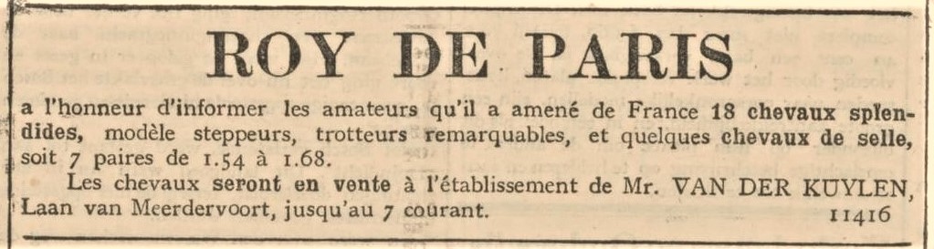Op het jaarlijkse concours in ’s-Gravenhage zelf komen ook de grote handelaren uit Brussel en Parijs in de ring. Het is enerzijds concurrentie en tegelijkertijd doen de Nederlandse handelaren er hun voordeel mee; niet zelden weet een Nederlandse klant vol trots te vertellen zijn koetspaarden in Parijs te hebben gekocht, terwijl hetzelfde span door de Parijse handelaar in Nederland is aangekocht. ‘Parijs’ is in. In het Dagblad van Zuidholland en ’s-Gravenhage van 5 september 1904 staat een voorbeeld van die samenwerking, geadverteerd in het Frans, zodat het de chique doelgroep aanspreekt: “Roy uit Parijs heeft de eer om de amateurs te informeren dat hij uit Frankrijk 18 prachtige paarden, tuigtypisch (vrij vertaald, red), opmerkelijke dravers en enkele rijpaarden heeft meegebracht, 7 spannen van 1,54 tot 1,68. De paarden zullen te koop zijn bij de vestiging van dhr. Van der Kuijlen, Laan van Meerdervoort.”
