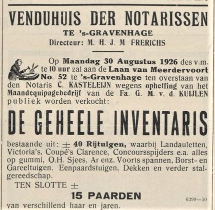 Hegen verkoopt aan Van der Kuijlen in dezelfde koopakte als het gebouw ook rijtuigen en stalbenodigdheden, met ‘wellicht later’ de paarden.