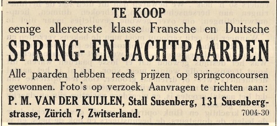 Medio november komt De Paardenwereld nog even terug op stal Meerdervoort van Van der Kuijlen: “De zaak heeft in den loop der jaren alles mede gemaakt. Het bloeiende maandpaarden- en equipagebedrijf moest plaatsmaken voor den auto, doch, werd niet geheel door de motortractie verdrongen, daar er nog altijd paardenliefhebbers zijn en blijven die het paard boven den auto prefereren, zowel voor plezier als voor dienst. Door de import van buitenlandse paarden, zoals verleden jaar nog de Canadezen, kwam er weer wat leven in dat bedrijf en heeft de heer Willem van der Kuijlen nu het voornemen, na het overlijden van zijn compagnon, waarmee hij circa dertig jaar lang geassocieerd is geweest, voort te zetten. Naar wij vernemen heeft genoemde heer wederom grote aankopen in het buitenland gedaan en hopen wij, dat de heer Willem van der Kuijlen, bijgestaan door den heer Piet van der Kuijlen junior en de heer Sieben Wassenaar, die ook al zijn zilveren jubileum achter den rug heeft, er in mogen slagen deze zaak nog jaren te kunnen voortzetten. Wij brachten een bezoek aan de stallen en zagen tot ons genoegen, dat er weer uitgezocht paardenmaterieel aanwezig was. Het is den eigenaar der zaak wel toevertrouwd, die vergrijsd in het vak, nog steeds zijn voile energie en liefhebberij in de paardenbeweging behouden heeft. Wij zagen enige spannen uit Weenen, België en meerdere hackney’s, waaronder zeer goede exemplaren. Later hopen wij deze paarden veel op onze concoursen te zien en zullen zij voorwaar geen slecht figuur maken.”