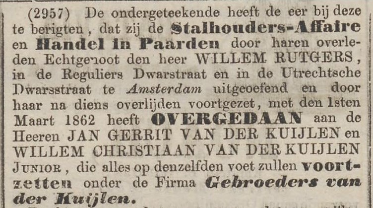 In de hoofdstad begint het verhaal in 1862 wanneer Willem Christiaan junior (1838-1899) en zijn broer Jan Gerrit (1835-1890) er vanuit Den Haag naartoe trekken. De twee jongens nemen als Gebroeders Van der Kuijlen de stalhoudersaffaire over van de weduwe Rutgers, aan de Reguliersdwarsstraat en in de Utrechtschedwarsstraat. Willem Rutgers (1809-1861), afkomstig uit een bekende Arnhemse stalhoudersfamilie en getrouwd met een Duitse koetsiersdochter, had er van 1837 tot zijn overlijden een goedlopend bedrijf en handelde in paarden, zoals in 1853 twee donkerbruine merries ‘a deux mains’ van vijf jaar oud en edel ras. Na zijn overlijden houdt de dappere weduwe het een jaar vol om het bedrijf te combineren met de opvoeding van drie jonge kinderen, maar dan gaat ze toch overstag voor de verkoop.