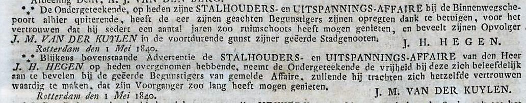 Op 1 mei 1840 koopt Johannes Marinus van der Kuijlen (1806-1864) in Rotterdam een ‘pand, bestaande uit drie stallingen, koetshuizen en bovenwoningen’ aan de Binnenwegsche poort, tussen de Baan en de Binnenvest. De verkoper is Jan Hendrik Hegen, wiens vader Pieter als stalhouder aan diezelfde poort in 1798 een reiskoets te koop aanbiedt, net als in 1814 ‘Twee fraaije, welgeschilderde coupé-koetsen, onlangs van Londen aangekomen, te zien bij den koetsier Hegen’ (Rott.Cour. 5-5-1814).