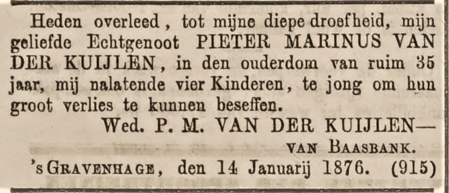 “Heden ontsliep zacht en kalm in de vreeze des Heeren, na een langdurig en geduldig lijden, tot diepe droefheid van mij en mijne kinderen, mijn innig geliefde echtgenoot Johannes Marinus van der Kuijlen, in den ouderdom van 58 jaren, na eene gelukkige echtvereniging van ruim 30 jaren”, laat zijn echtgenoot Maria Cabri weten op 24 april 1864, twintig jaar nadat de grondlegger van de stalhouderij Van der Kuijlen in Rotterdam uit Den Haag vertrok.
