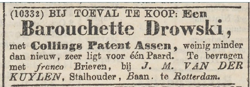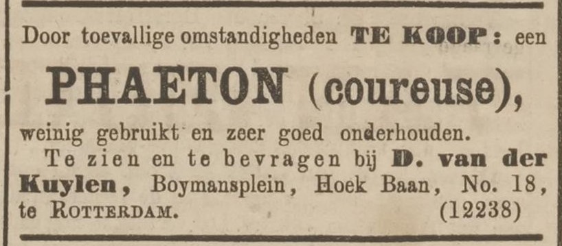 Vooralsnog gaat Van der Kuijlen door als koopman op de oude plaats, waarvan de straatnaam verandert van Baan in Boymansplein en nadat diens standbeeld er komt te staan (1867) in Van Hogendorpsplein. Johannes Marinus heeft af en toe een gelegenheidshandeltje, net als zijn voorganger, zoals ‘bij toeval te koop’ een barouchette-drowski op patent-assen en zeer licht voor één paard (Nw. Rott. Cour. 20-11-1857). Of een ‘zeer net en solide’ tentwagentje voor grote bok of ezel’ (Nw. Rott. Cour. 28-7-1863).