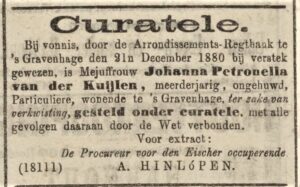 De welvaart die hun vader ze nalaat, kan het geluk niet afdwingen. Pieter sterft op z’n 35ste. Twee broers vertrekken naar Amsterdam. En dan is er nog een zus als zwart schaap in de familie. Johanna Petronella kan na het binnenlopen van de erfenis de verleiding niet weerstaan en geeft het geld kwistig uit. In 1880, nadat ook haar moeder is overleden, wordt zij bij verstek onder curatele geplaatst ‘terzake verkwisting’. Maar luisteren naar de curator die de rechtbank haar toewijst doet ze niet, en die voelt zich geroepen om een oproep te plaatsen met “waarschuwt een ieder en een iegelijk geen krediet te verleenen aan de curanda, zullende van het op krediet geleverde hoegenaamd niets worden gehonoreerd.” Zeven jaar later overlijdt de vrijgezelle jongedame, slechts 34 jaar oud.