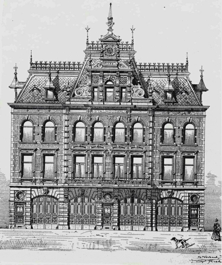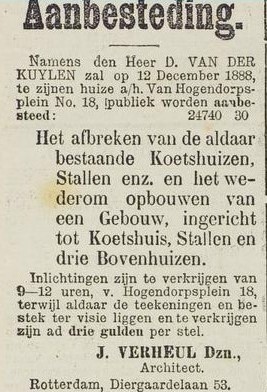 In het Bouwkundig Weekblad (nr. 3, januari 1889) geeft Verheul een toelichting: “Dit gebouw wordt opgericht op een terrein, dat slechts aan eene zijde is bebouwd; de voorgevel en beide zijgevels grenzen dus aan den openbare weg. Het Van Hogendorpsplein is ruim van afmetingen, zodat een hoge gevel er op zijn plaats is. Het is zeker een der dankbaarsten punten van Rotterdam, om een gevel goed te doen uitkomen. De straten waaraan de zijgevels zijn gelegen, zijn echter zeer nauw. Het gebouw, bestemd voor stalhouderij, heeft eene lengte van gemiddeld 29,17 m en een breedte van gemiddeld 18 m. Om zoveel mogelijk grote ruimten te vermijden, die voor een particuliere stalhouderij niet gewenscht zijn, is de stal in drie afdelingen verdeeld, met het oog op 1.) het gebruik, 2.) op het uitbreken van ziekte onder de paarden, zodat elke stal van de andere kan worden afgesloten en 3.) omdat dergelijke stallen, bij het voortdurend in- en wegbrengen van paarden zoals dit dikwijls voorkomt, in den winter niet zoo koud zijn als gewoonlijk. Een der drie stallen doet dienst als heerenstal, en is voorzien van twee boxen, en op zogenoemde Engelse wijze ingericht. De standplaatsen voor paarden zijn hier ruimer dan in de overige stallen, die voor gewone werkpaarden worden gebruikt. Deze laatste zijn op gewone Hollandsche wijze ingericht. Boven de stallen zijn de hooizolders en haverkamer geplaatst. Het koetshuis is ongeveer 275 vierkante meter groot, en heeft een toegang naar den hooizolder, de woning van den patroon, de haverkamer enz. Boven het koetshuis zijn drie bovenwoningen ingericht, waarvan de twee buitenste verhuurd worden. Daar het een eisch was, dat de toegangen naar deze bovenhuizen in het midden en aan den einden van den gevel kwamen, deze zich bij het indelen der plattegronden eigenaardige bezwaren voor die, volgens mijn gevoelen, zoo goed als mogelijk zijn opgelost. Het geheel kan niet onder de rijk uit te voeren bouwwerken worden gerangschikt, doch een en ander is met het oog op de bestemming soliede behandeld. De voorgevel is ontworpen, enigszins in verhouding tot het plein. De onderpui en het balkon zijn geheel van hardsteen, terwijl het hogere gedeelte van den gevel wordt opgetrokken van waalsteen net lijsten, banden en versieringen van getrokken en gestampte cement. Het geheel werk is door den heer T.L. Kanters, aannemer alhier, aangenomen voor den som van ƒ 48.880,-. De begroting was ƒ 51.405,-, waaronder moest gerekend worden eene tegemoetkoming van ƒ 1.500,- voor de afbraak van de bestaande inrichting, hetgeen dus bij de begroting of de aanneemsom gevoegd moest worden om tot den kostenden prijs van het werk te komen. Het geheel moet in het einde van dit jaar voltooid zijn.”