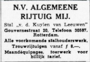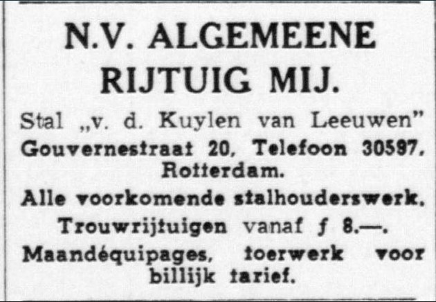 Tegen de tijd dat Leo overlijdt in 1925 laat hij een stalhouderij achter aan de Gouvernestraat 20. Leonardus Adrianus ‘Leo’ van Leeuwen neemt de stal en de firmanaam over; tegen 1940 is het de NV Algemeene Rijtuig Mij. ‘v.d.Kuylen-Van Leeuwen’ waar een trouwrijtuig voor zes gulden gereed staat – de puissant rijke mr. Jaap van der Kooij uit Blaricum sponsort de zaak omwille van de fijne jeugdherinneringen die hij aan de stal heeft. Van Leeuwen overlijdt in 1943, maar de laatste stalhouderij van Rotterdam blijft bestaan.