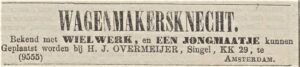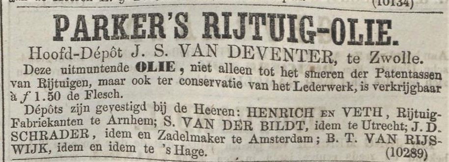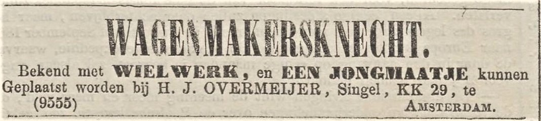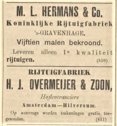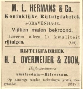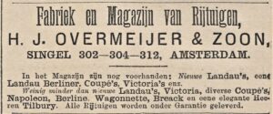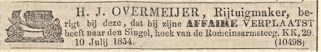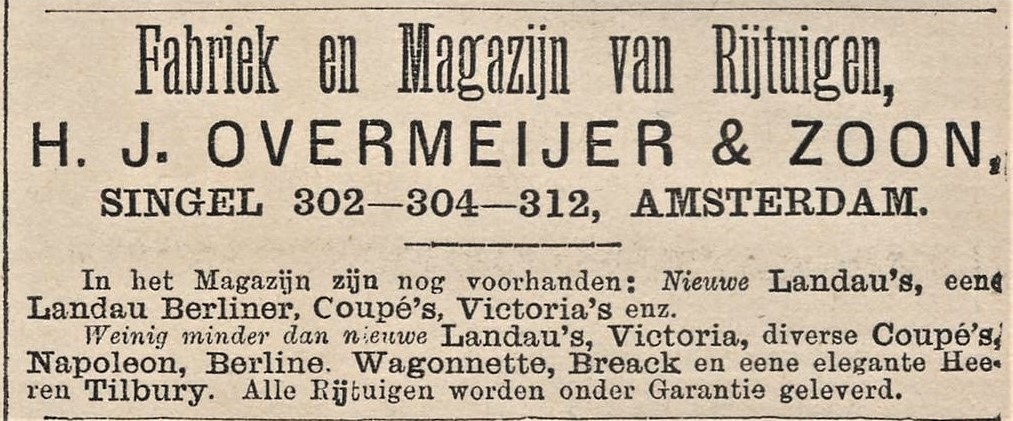 In juli 1854 maakt de 27-jarige, vrijgezelle Hendrik Jurriaan Overmeijer (1827-1893) bekend dat hij zijn affaire als rijtuigmaker heeft ‘verplaatst’ naar de Singel, hoek Romeinsarmsteeg. Met andere woorden hij is langer in het vak actief. Waar en hoe hij het leerde, weten we niet, wel dat zijn vader een slepersbedrijf heeft en de ganse familie in een stalhouderij werkt. Gelegenheid genoeg om ervaring op te doen. Twee jaar na zijn start aan de Singel is de jonge Overmeijer op zoek naar knechten die hem gaan helpen, zoals een bekwame bakwerker, en gaandeweg groeit het personeel met een wagenmakersknecht ‘bekend met wielwerk’ en een jongmaatje. Ze bouwen luxe rijtuigen als landauer en coupé clarence, waarvoor ‘de deugdzaamheid wordt gegarandeerd’. De echte vaart komt er in, wanneer Overmeijer in 1878 het werk van de rijtuigfabriek Schrader overneemt.