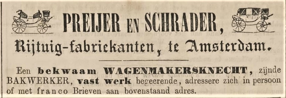 Schrader stamt nog uit het tijdperk van de gilden, waarin rijke lieden een rijtuig kochten van de mr.zadelmaker en de tijd van vóór de stoomtrein. De Schraders kwamen van oorsprong uit Hannover om te werken aan boord van de schepen van de Verenigde Oost-Indische Compagnie, Johan Diederick Schrader verdient op zijn beurt de kost aan de reders en kooplieden aan wal, door eind 18e en begin 19e eeuw solide landouwer-drowski’s en voor de reis ingerichte coupés te bouwen, rijtuigen die hij bekleedt met zilverkleurig laken en damast van zijde. Zijn vestiging aan de Reguliersdwarsstraat is een logische, want hier zit een deel van de koetshuizen die bij de ‘paleizen’ in de Gouden Bocht horen. De clientèle aldaar levert een fijn belegde boterham op, want niet alleen heeft zijn echtgenote het gemak van inwonende dienstmeiden, hij kan ook de dienstplicht van zijn zoon Johann Gustaaf Gerhard (1831) afkopen. Die zoon zet de rijtuigfabriek verder met een andere van oorsprong Duitse rijtuigfabrikant in dezelfde Reguliersdwarsstraat, Barend Preijer, wiens vader Johannes er al in 1827 toewagens, char-à-bancs, kiereboes en fourgons maakte. Twee keer een tweede generatie die samen gaan. De firma Preijer & Schrader, waarvan Barend Preijer in 1863 afscheid neemt wegens een zwakke gezondheid, bestaat tot 1878.