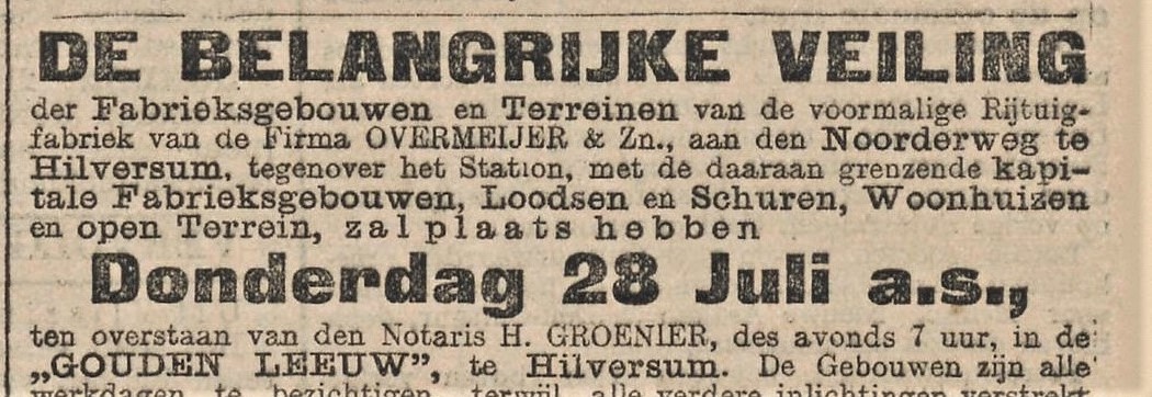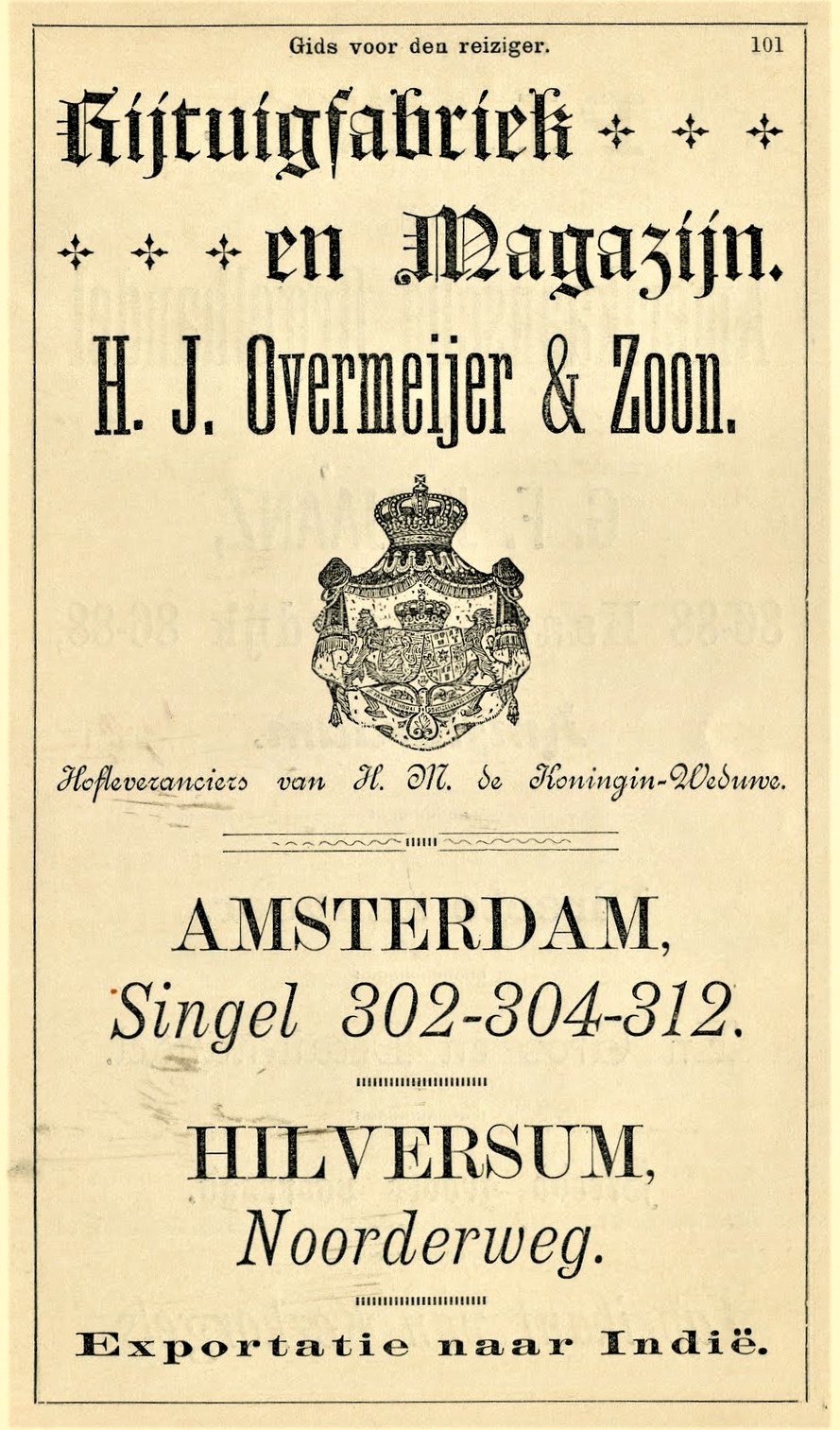 “Van de bekende rijtuigfabrikantenfirma H.J. Overmeijer & Zoon, te Amsterdam, is eene filiale gesticht te Hilversum”, meldt het Nieuws van den Dag op 9 maart 1896. Die nieuwe vestiging aan de Noorderweg en het predicaat als hofleverancier zullen nieuwe deuren openen, hoopt Jan Hendrik, die vanaf dat moment fanatiek adverteert in de Deli Courant op Java, met het gratis toezenden van tekeningen. Overmeijer gaat het avontuur niet aan om ter plekke een agent aan te stellen en rijtuigen op goed geluk voor de verkoop naar Indië te verschepen. Hij werkt alleen op bestelling vanuit Nederland. Twee jaar lang adverteert hij iedere week. En daarna is het over: blijkbaar is het niet of onvoldoende gelukt om een stukje van de koloniale markt mee te pikken. Het onderdeel ‘marketing’ is niet het sterkste onderdeel, want in tegenstelling tot andere, grote rijtuigfabrikanten laat de fabriek nooit een product op een tentoonstelling zien. Overmeijer vertrouwt op een goede naam. En dat gaat goed, getuige het aantal personeelsleden dat er loopt, vele tientallen, van stoffeerders, schilders, waaronder een wapenschilder, bakwerkers tot vuurwerkers. In 1899 krijgt de meesterknecht van de smederij, de 26-jarige Johannes Wilhelmus Kraan, een medaille en getuigschrift van de Vereeniging tot bevordering van de Fabrieks- en Handwerksnijverheid. Werkgever Jan Hendrik trouwt als weduwnaar van Anna Maria Elisabeth Boseker in 1901 voor de tweede maal, met de zestien jaar jongere Cornelia Leonarda Adriana van Merkesteijn, de dochter van een kleermaker op Java (geb. Semarang, 1876).