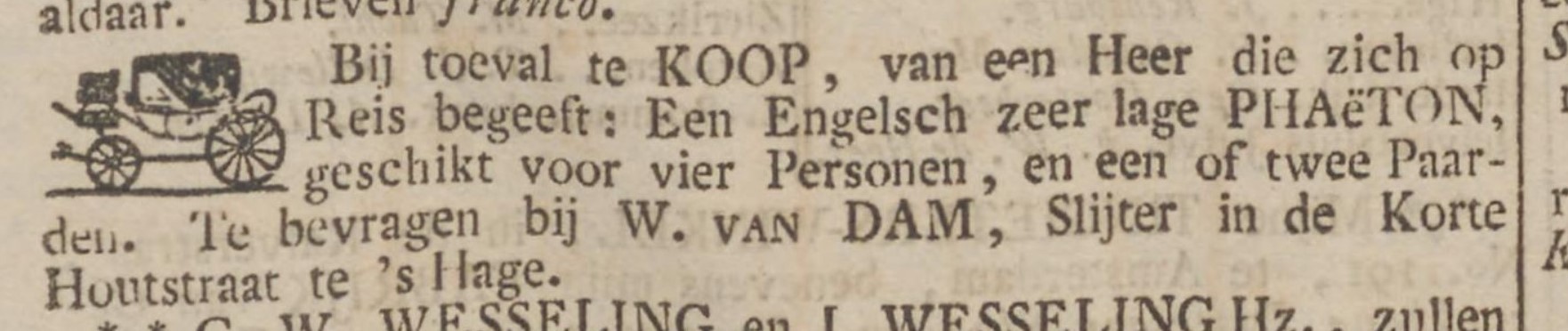 De eerste vermelding van een Nederlandse phaeton betreft het exemplaar dat Harmen Smeeking op 1 november 1725 in Leiden verkoopt. Harmen verkoopt bovendien een koets, een koets-coupé, een speelwagen, een kales en een Dantziger wagen (Leydse Courant 26-10-1725). Die opsomming is relevant, omdat de phaeton hiermee is gepositioneerd naast de ‘koets’, waaronder men een berliner verstaat. En uit meerdere verkooplijstjes is op te maken dat een phaeton blijkbaar niet is te verwarren met een (ongeveerde) speelwagen. De bezitters zijn kapitaalkrachtige lieden, zoals baljuw en hoofdofficier Jacob Gool van Bosveld in Beverwijk, die na zijn overlijden in 1733 een ‘zwaar vergulde en fijn geschilderde’ phaeton en een net zo rijk versierde chais nalaat. De rest van de inboedel geeft een idee van de volledige equipage: de man had drie bonte paarden, tuigen van rood leer en met wit garen gestikt, gele koorleidsels en gele kwasten aan het (borst)tuig. Het is een opvallende vertoning geweest.