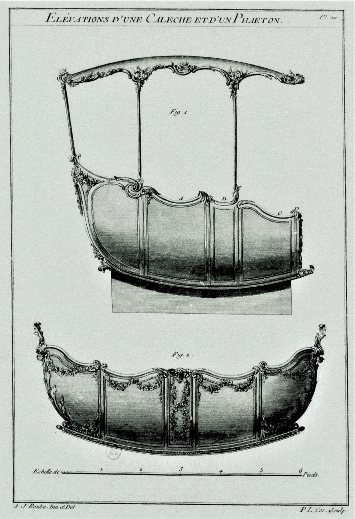 Phaeton (onder) en calèche in ‘L’art du Menuisier-Carrossier’ (1769-1775) van Roubo.