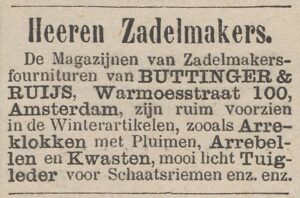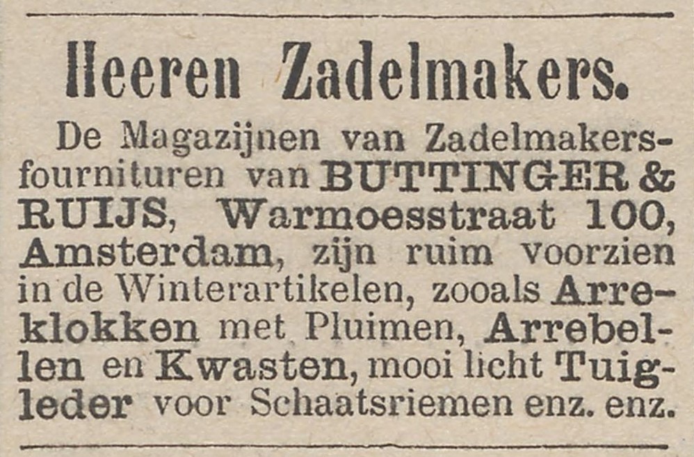 In 1869 huwt K. Gruno Buttinger (1848-1893), zoon van een Groningse kopergieter, met een Amsterdams meisje Ruijs en twee jaar later trouwt Gruno’s zus met de Amsterdammer Hendrik Ruijs (1848-). De zwagers starten onder beider naam een groothandel in zadelmakersfournituren; gespen, ringen en monogrammen die kopergieters als hun vader maakten. Hun magazijn ‘Het Gezadelde Paard’ zit aan de Warmoesstraat 100 in Amsterdam. Ze maken ook gaskronen en aan de zadelmakers leveren ze niet alleen gespen en andere metalen tuigdelen, maar ook het kostbare trijp om tuigen te versieren en watertwist (katoengaren).