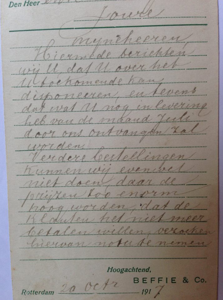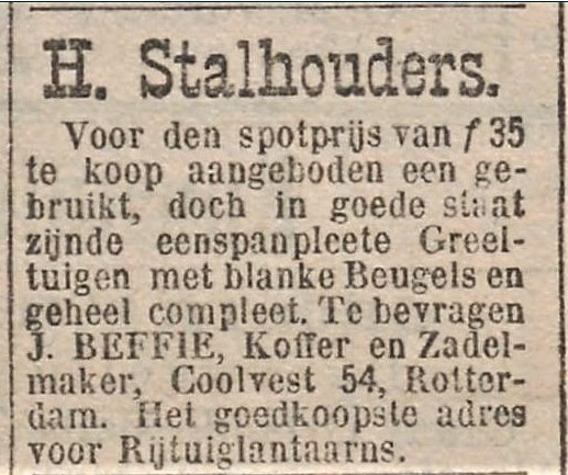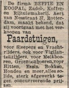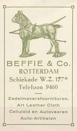 Van de derde generatie zadelmakers in Rotterdam zet Jesaias (1879-1942) het ouderlijk bedrijf verder onder de firmanaam Beffie & Co. Hij trouwt op 1 december 1909 met Leentje Blazer, en woont met zijn gezin aan de Schieweg 123b, naast zijn zus Marie en haar man. De Eerste Wereldoorlog is echter voelbaar in de zaak. Op briefkaarten die zijn gestuurd aan de firma Keverling, leverancier van tuigenbeslag in Joure, is te lezen hoe slecht het gaat met Beffie & Co in oktober 1917: “Verdere bestellingen kunnen wij evenwel niet doen daar de prijzen zoo enorm hoog worden, dat de klanten het niet meer betalen willen.” Eventjes lijkt er sprake van enige voorspoed, als in de Haagsche Courant van 22 december 1919 een advertentie verschijnt waarin Beffie & Co een ‘flinke 1ste klas zadelmaker, benevens een halfwas’ zoekt.