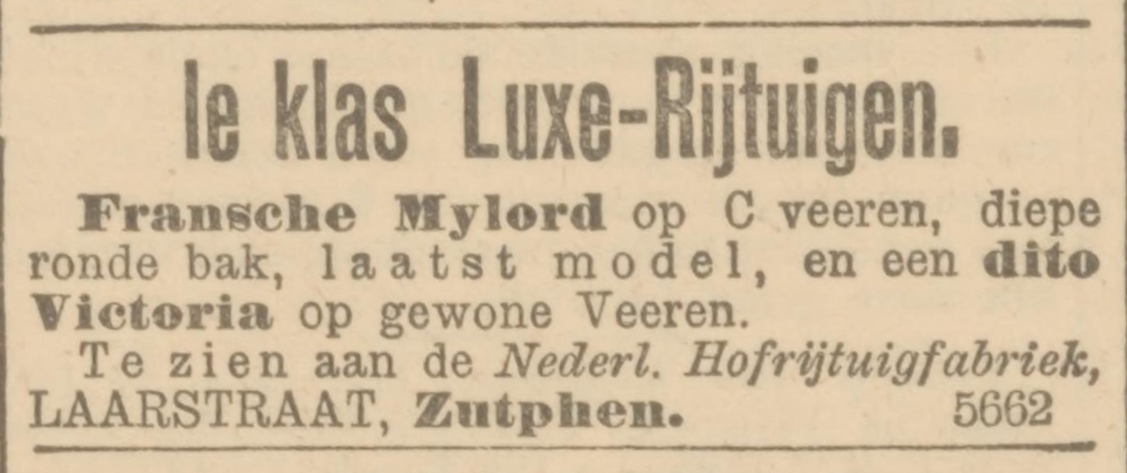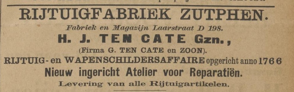 Zakelijk gaat het voor de wind: vader Gerret en zoon Henk verschaffen werk aan drie of vier schildersknechten, doen in toenemende mate herstelklussen aan rijtuigen en gaan zich profileren als rijtuigfabriek Firma G. ten Cate & Zoon aan de Laarstraat. De grote omslag komt later, in januari 1895 met een feestelijke opening: “Nieuw ingericht atelier. Door deze hebben wij de eer te berichten, dat wij speciaal zijn ingericht tot het fabriceren en repareren van rijtuigen. Belastten wij ons sedert jaren met de uitvoering bovengenoemd, thans hebben wij voor eigen rekening een fabriek opgericht, en kunnen zoodoende de nieuwe werkzaamheden en reparatiën veel netter, solieder en vlugger uitgevoerd worden dan voorheen, daar wij thans met eigen personeel, werktuig en materialen werkzaam zijn. Onze nieuwe ingerichte lakkamer voldoet aan de strengste eischen des tijds. Wij vestigen vooral de aandacht op onze wielen met Amerikaansche naven, Hickory spaken en Hickory gebogen velgen, velgen uit één stuk, eigen fabrikaat eenig adres, alsook in essenhout met rail- of gewoon beslag. Deze wielen zijn oneindig veel solieder, fraaier en vlugger gebouwd dan de gewone wielen, thans in gebruik van iepen naven en stukvelgen, doch laatstgenoemde worden ook door ons gefabriceerd.” Op de Amerikaanse wielen uit één stuk uit de eigen werkplaats geven de Ten Cate’s twee jaar garantie. Om ze te maken moet er een grote stoomketel en pers zijn.