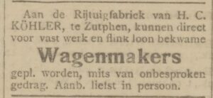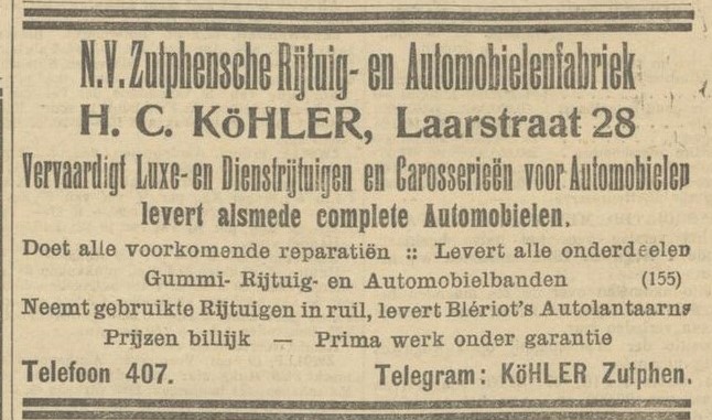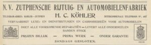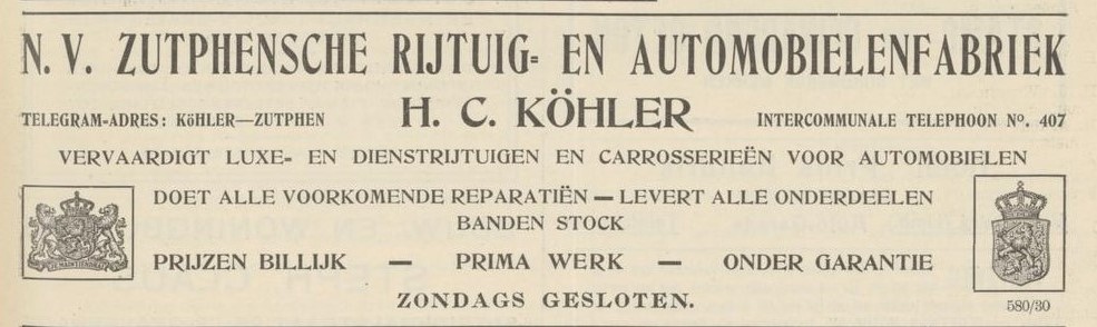 Köhler gaat op zijn beurt na het faillissement verder als directeur van de NV Zutphense Rijtuig- en Automobielenfabriek. Köhlers zoon Gerrit Frederik is ten tijde van zijn huwelijk in 1918 rijtuigschilder in de fabriek. In 1924 plaatst Köhler de laatste advertentie; in de tussentijd is hij het wapen van hofleverancier gaan voeren. Zonen Henri Christiaan Köhler en Johan George Köhler, aanvankelijk onderwijzer, richten op 20 juli 1925 de NV H.C. Köhlers Automobielhandel en Carrosseriefabriek op in Dieren; de tijd van het rijtuig is dan definitief voorbij.
