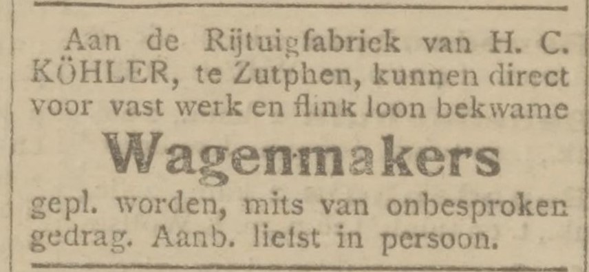 Henri Christiaan Köhler (1868-1943) is de zoon van een Amsterdamse meubelmaker. Hij is in 1892 te Arnhem getrouwd met Gertruda Willemina Starrenburg (1875-1949). Onder zijn leiding maakt de Hofrijtuigenfabriek strijdwagens voor de Romeinse wagenrennen in het ‘Circus Maximus’ ter gelegenheid van de Utrechtse maskeradefeesten in 1906. Koningin-moeder Emma en prins Hendrik zien die strijdwagens in volle vaart door de arena vliegen. Maar de fabriek gaat in 1909 failliet, waarbij eerst het pand aan de Laarstraat 28 inclusief machines en gereedschappen onder de hamer komt en vervolgens de rijtuigvoorraad: gedeeltelijk nieuw, gedeeltelijk tweedehands, waaronder een nieuw model victoria, een nieuw model buggy met gummibanden, een zespersoons break, een berliner-vigilante, een brikje, victoria’s, een calèche,een landauer, een tilbury, Utrechtse wagentjes en dogcarts. Pikant detail van het faillissement: dan is het plots weer Hofrijtuigenfabriek Ten Cate & Zoon, zonder Köhler. Het faillissement eindigt in 1911.