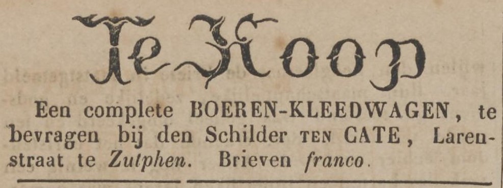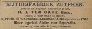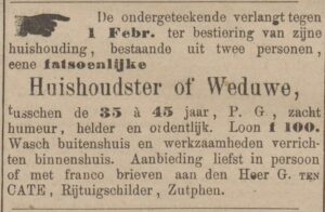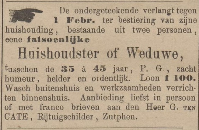 Gerret (1822-1903) is getrouwd met daglonersdochter Willemina Aleida Ophoff, maar zij sterft in 1884, waarna hij achterblijft met hun enige kind, de zeventienjarige Henk (Hendrik Jan). Twee alleenstaande kerels die lange dagen werken vragen om een huishoudelijke hand: “De ondergeteekende verlangt tegen 1 febr. ter bestiering van zijne huishouding, bestaande uit twee personen, eene fatsoenlijke Huishoudster of weduwe, tusschen de 35 a 45 jaar, P.G., zacht humeur, helder en ordentlijk. Loon f 100. Wasch buitenshuis en werkzaamheden verrichten binnenshuis. Aanbieding liefst in persoon of met franco brieven aan den Heer G. ten Cate, rijtuigschilder, Zutphen.” (Zutp. Cour. 24-12-1885).