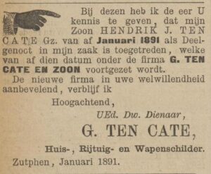 Zeven jaar na het overlijden van zijn moeder treedt Henk (1867-1955) als vijfde generatie toe tot de rijtuig- en wapenschilders-affaire. De Ten Cates zijn al vanaf 1766 werkzaam als schilders te Zutphen. Henk trouwt met slagersdochter Margrietha Hendrika Meerstadt en ze krijgen in 1893 een zoon.