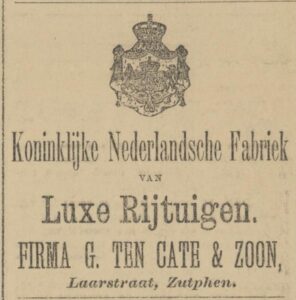 Toch zijn het de ‘dogcarren’ die een erediploma krijgen op de landbouwtentoonstelling in Winterswijk een jaar later; de scholtenboeren van de Achterhoek zijn gemakkelijker door een ‘provinciaalse’ rijtuigmaker te overtuigen dan het establishment in Den Haag. Ten Cate hoopt natuurlijk te profiteren van zijn voordracht door de koningin-moeder; het is echter lastig te zeggen in hoeverre zij tot zijn klandizie behoort. Paleis het Loo ligt op afzienbare afstand van Zutphen en dat de relatie met het koningshuis er is, zal ook later nog blijken. Mogelijk heeft Ten Cate voor de koningin-moeder op persoonlijke titel werk geleverd en is zijn naam daarom niet in de boekhouding van het Koninklijk Huisarchief terug te vinden; het reguliere rijtuigwerk op Het Loo doet Schimmel uit Apeldoorn.