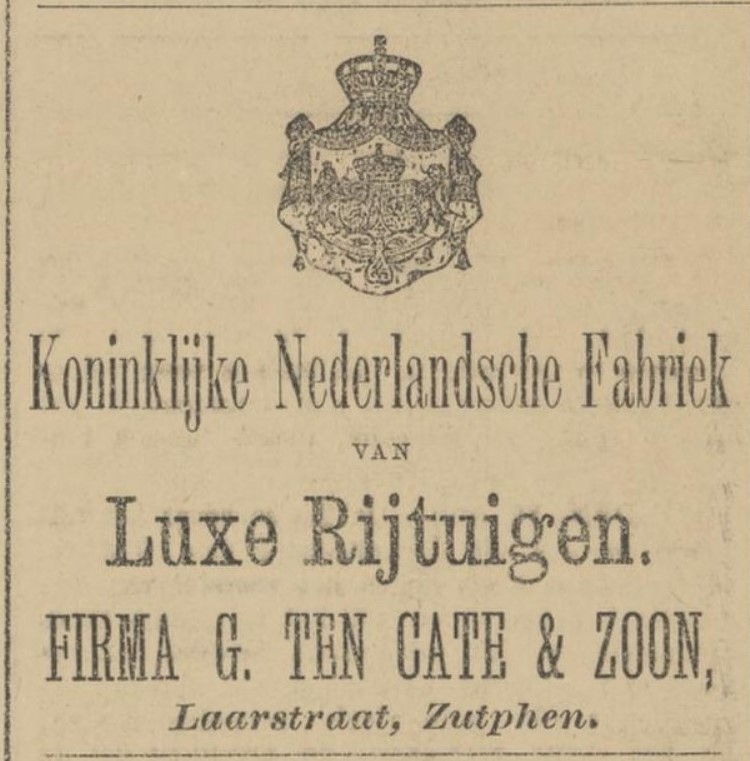 In het koetshuis van kasteel Weldam in het Overijsselse Markelo staat een grote wagonette-break, zo een waarmee jagers zich op een winterdag in het jachtveld lieten vervoeren. Het rijtuig oogt groen, maar het zal onder een donkere vernislaag ongetwijfeld donkerblauw zijn met witte biezen: de heraldische kleuren van de grafelijke familie Van Aldenburg Bentinck, tot wie het kasteel behoort. Nadat een wiel van de as is gehaald, is zichtbaar wie de break heeft gemaakt: G. ten Cate & Zoon in Zutphen, een minder bekende rijtuigfabriek die desalniettemin de titel van ‘hofrijtuigenfabriek’ mocht voeren.