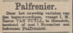 Na hun huwelijk trokken ze in bij haar ouders op Bosch en Vaart in Heemstede, met als buren van mevrouw Van Merlen en Van Tuyll’s broer op het aanpalende Velserbeek. Er gebeurde niet veel dat de krant haalde, hooguit dat in 1880 een dief er al het zilverwerk weghaalde, behoudens het tuig… Een jaar later liep de boef tegen de lamp. Een ander akkefietje deed zich voor in 1890 met het ‘onwettig weglopen’ van de palfrenier op Bosch en Vaart, waarbij de reden uiteraard discreet in het midden bleef. Koetsier op Bosch en Vaart was Hendrik Benkemper (1839-1911), de zoon van een wijnkoopman, die net als zijn vrouw Margaretha Louwerens (1832-1908) was meegekomen met de Van Tuyll’s uit Amsterdam. Die Amsterdamse relaties verklaren gemakkelijk waarom er in het koetshuis van Bosch en Vaart tuigen van een Amsterdamse tuigenmaker aan de muur hingen, en met name dat schitterende galatuig. Het is aannemelijk dat het tuig en de coupé alleen in Heemstede zijn gebruikt. Het past bij de status van de voorname families die daar aan de rand van het duingebied woonden, richting Bloemendaal, en het zal dan ook niet zijn gebruikt voor een bepaalde functie van Van Tuyll; de titel Heer van Vleuten was er een op papier. Het kwam misschien een zeldzame keer uit de kast voor een jubileum of trouwend neefje of nichtje.