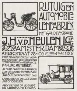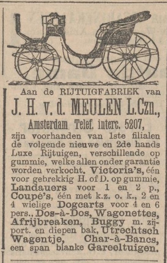 “Aan de Rijtuigfabriek van J.H. v.d. Meulen L.Czn., Kerkstraat 105-78, Amsterdam, kunnen Smids-Bankwerkers en Wagenmakers geplaatst worden, liefst direct. Ook Halfwassen.” (Nws vd Dag 15-12-1899). Het aantal vacatures geeft aan dat het om een serieuze fabriek gaat, waarin niet alleen de nodige knechten lopen, maar ook met een aparte houtafdeling en smederij. ‘Fabriek en Magazijnen van luxe rijtuigen’ heet het dan. De markt voor luxe rijtuigen in de hoofdstad wordt gedomineerd door Schutter & Van Bakel, Kimman, Spijker en Overmeijer, maar ook Van der Meulen en bijvoorbeeld Mudde pakken een graantje mee van de groeiende welvaart aan het einde van de 19e eeuw. Er is behoefte aan het standaard repertoire in een particulier koetshuis: coupé, victoria en landauer, maar ook aan klein gerij voor de kinderen. “Vertrouwde Pony te Koop, met Tonneau en Tuig, compleet ƒ 875,- zeldzaam lief dier, stokmaat 1,19 m, merrie, 8 jaren oud, uitstekend geschikt om kinderen alleen er vertrouwd mee te laten rijden, omdat het nergens bang voor is, wordt gegarandeerd”, zo adverteert Van der Meulen (Nws vd Dag 28-3-1904).