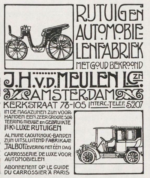 In 1906 komt de overstap naar carrosserieën voor auto’s, waarvoor een bekleder wordt gezocht, eentje die geheel zelfstandig kan werken en gewoon is om naar de ‘Fransche methode’ te werken. Van der Meulen heeft dan nog de ambitie om te concurreren tegen Schutter & Van Bakel, de grotere en Frans georiënteerde rijtuig- en automobielenfabriek verderop in de Kerkstraat. Van der Meulen adverteert niet voor niets dat ook hij een abonnement heeft op het Franse vakblad Le Guide de Carrossier, waar de laatste modellen uit Parijs uit zijn na te bouwen, althans als je de tekeningen bestelde. Van der Meulen merkt ook een ander aspect van de opkomende auto’s, want zijn voorraad aan tweedehandsrijtuigen loopt geleidelijk aan verder op tot een dertigtal. Te koop of per maand te huur. Opvallend is dat Van der Meulen ze aanprijst met de naam van de oorspronkelijke bouwer, er van uit gaande dat een bekende(re) fabrikant meerwaarde geeft. Hij zet er dus geen wieldoppen met zijn eigen naam op, hetgeen andere handelaren soms wel doen. Een coupé, gebouwd door buurman Van Schutter & Van Bakel, hoeft bij hem nog maar ƒ 450,-, de helft van het geld, te kosten, terwijl een calèche van Henrich & Veth al zo gedateerd is, dat ƒ 150,- volstaat. Nieuw zal dezelfde calèche veertig jaar eerder het tien- of zelfs twintigvoudige hebben gekost. De inruilwaarde van een rijtuig laat zich niet vergelijken met die van automobielen, omdat een rijtuig geen motor en mindere bewegende delen die aan slijtage onderhevig zijn, en bovendien een lagere snelheid heeft, waardoor minder slijtage optreedt. Bij goed onderhoud en met een enkele keer opnieuw schilderen en stofferen kan een rijtuig generaties lang mee. Het is dan ook vooral de mode die de prijs bepaalt, zeker als een klant zich wil meten met de beau monde van Parijs of Londen. Voor het bepalen van die mode in de rijtuigen zijn met name de wereldtentoonstellingen en exposities van nijverheid van belang. Vandaar dat Van der Meulen altijd vast blijft houden aan die ene medaille uit 1895.
