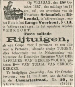 Van de rijtuigen en de equipage die Godert van der Capellen gebruikte is alleen een schets te maken. Als politicus reisde hij frequent heen en weer tussen de Utrechtse buitenplaats en zijn huis aan het Lange Voorhout 14 in ’s-Gravenhage. Bij dit laatste huis behoorden een stal en koetshuis aan de Casuariestraat 19, waar uit de nalatenschap van de douairière Baronesse van der Capellen van Berkwout, geboren Barones Van Tuijl van Serooskerken, in 1867 een ‘soliede’ coupé voor twee personen en een coupé voor vier personen, alsmede enige tuigen te koop kwamen. Het was een zeer bescheiden rijtuigpark voor stadsgebruik.