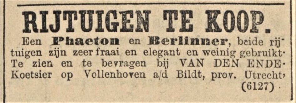 In de tweede helft van de negentiende eeuw gingen de rijtuigen technisch met sprongen vooruit ten opzichte van die in de tijd van Van der Capellen: ze werden lichter en beter geveerd. Ook de behoefte aan koetspaarden veranderde, in plaats van de zwarte merries die vooral uit Friesland kwamen, wilde de moderne mens liefst Gelderse ruinen en dan gecoupeerd; lange staarten waren uit de mode. Zo was dat ongetwijfeld ook op Vollenhoven. Na het overlijden van de laatste Kluppel in 1889 ruimde diens weduwe, geboren Van Hasselt, het koetshuis een beetje op, waarbij de phaeton, het sportrijtuig waarmee hijzelf ter ontspanning en inspectie over het landgoed rondstuurde, plaats moest maken, evenals de berline die als groot stadsrijtuig voor vier personen geen rol meer had te vervullen. Een dame alleen kon het prima af met een coupé en een victoria. Koetsier Martinus Johannes van den Ende (1844-1915) mocht de verkoop regelen. Die koetsier kwam als zoon van een gistkoper uit Den Haag, waar hij als 25-jarige reeds als koetsier werkte. Tot 1912 bleef Van den Ende op Vollenhove om de laatste jaren van zijn leven door te brengen bij zijn dochter in Utrecht. Mevrouw de weduwe zocht onderwijl een palfrenier, die zich, naast het assisteren van de koetsier, in de avonduren verdienstelijk kon maken door als huisknecht het eten te serveren en klusjes in de huishouding uit te voeren.