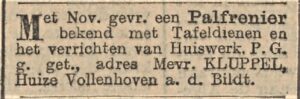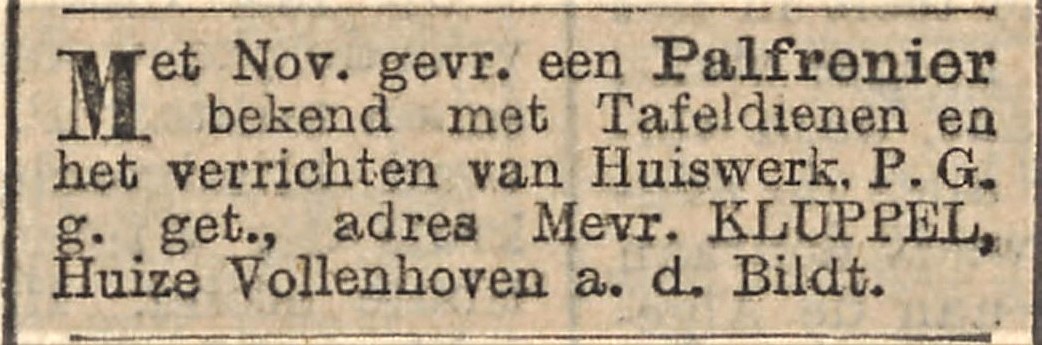 Een andere optie is dat de rijtuigen ‘oudjes’ zijn van de nieuwe bewoner van het huis Vollenhoven, dat met een deel van het landgoed, na het overlijden van Van der Capellen, in bezit komt van de Amsterdammer Johannes Jacob Kluppel en na 1862 diens gelijknamige zoon. Vollenhoven is opnieuw een buitenplaats voor in de zomerdagen, naast de stadswoning voor in de wintertijd, het huis aan de Herengracht 544 in Amsterdam. Wanneer de jonge mevrouw Kluppel een keukenmeid voor de Herengracht zoekt, moet dat er een zijn die ‘genegen is om des zomers mede naar buiten te gaan’. Evengoed geldt dat voor de koetsier en de palfrenier.